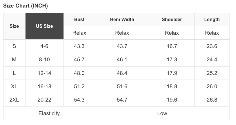 See size chart for approximate measurements