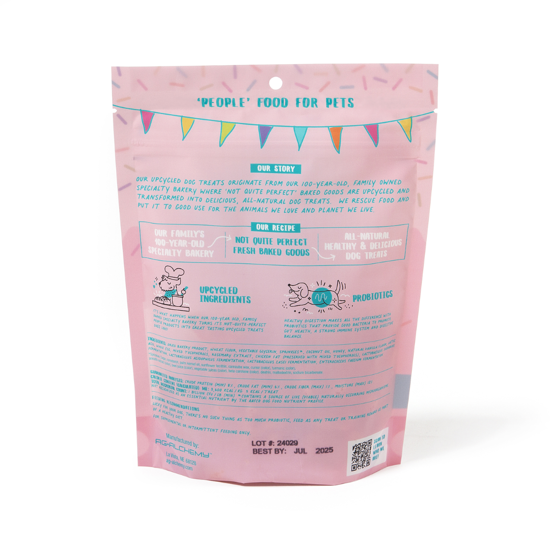 Ingredients: Dried Bakery Product, Wheat Flour, Vegetable Glycerin, Sprinkles*, Coconut Oil, Honey, Natural Vanilla Flavor, Lactic Acid, Whole Egg, Mixed Tocopherols, Rosemary Extract, Chicken Fat (Preserved with Mixed Tocopherols), Lactobacillus salvarius Fermentation, Lactobacillus acidophilus Fermentation, Lactobacillus casei Fermentation, Enterococcus faecium Fermentation. *Sprinkles: Sugar, cornstarch, palm kernel oil, sunflower lecithin, carnauba wax, cumin (color), turmeric (color), annatto extract (color), beet juice (color), vegetable juices (color), beta carotene (color), dextrin, maltodextrin, sodium bicarbonate. Guaranteed Analysis: Crude Protein: 8% min Crude Fat: 6% min Crude Fiber: 1% max Moisture: 12% max Calorie Content: (Calculated) ME: 3,600 kcal/kg ... 5 kcal/treat Total Microbial Count, minimum* 1 billion CFU/lb (Lactobacillus salivarius, Lactobacillus acidophilus, Lactobacillus casei, Enterococcus faecium.)