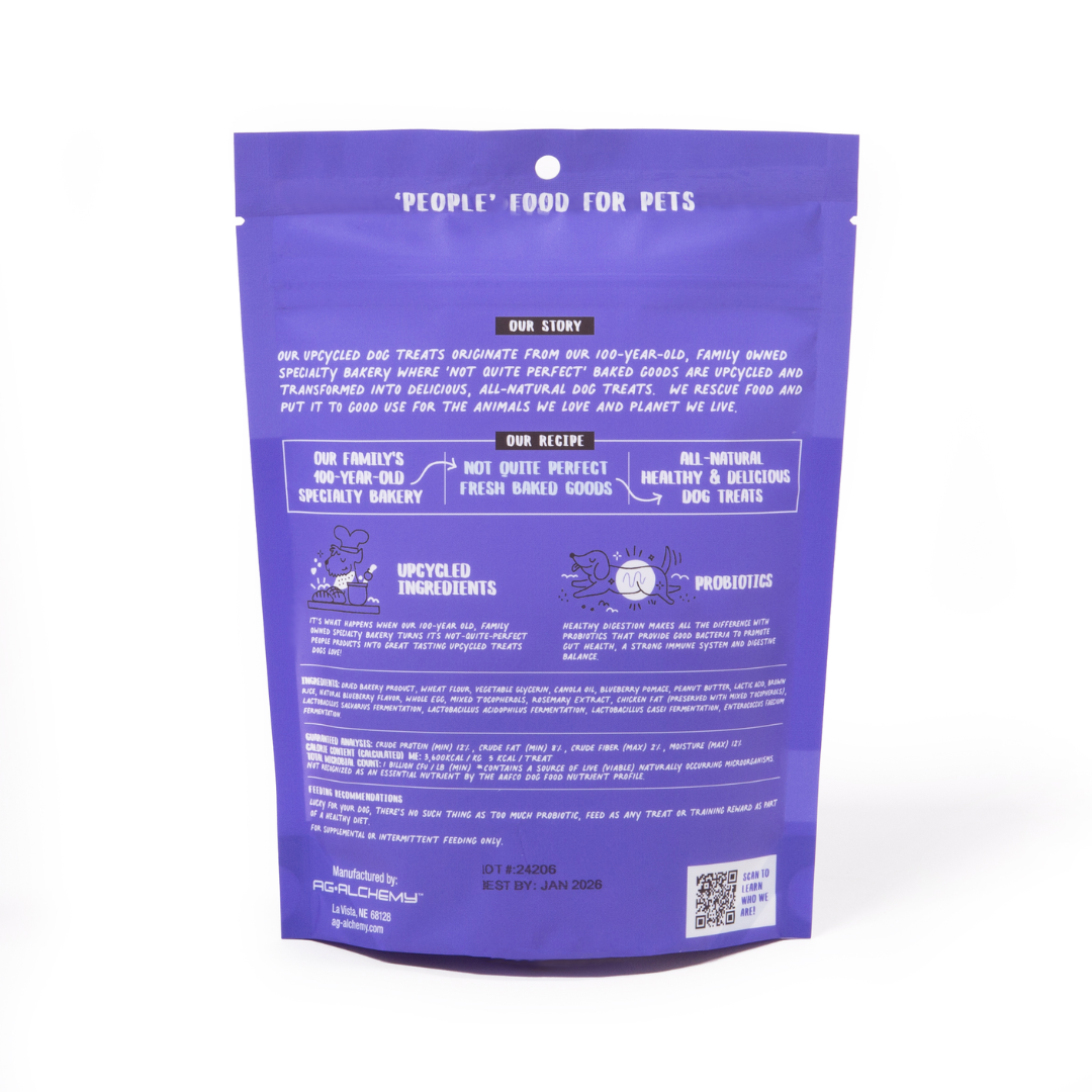 Ingredients: Dried Bakery Product, Wheat Flour, Vegetable Glycerin, Canola Oil, Blueberry Pomace, Peanut Butter, Lactic Acid, Brown Rice, Natural Blueberry Flavor, Whole Egg, Mixed Tocopherols, Rosemary Extract, Chicken Fat (Preserved with Mixed Tocopherols), Lactobacillus salvarius Fermentation, Lactobacillus acidophilus Fermentation, Lactobacillus casei Fermentation, Enterococcus faecium Fermentation. Guaranteed Analysis: Crude Protein: 12% min Crude Fat: 8% min Crude Fiber: 2% max Moisture: 12% max Calorie Content: (Calculated) ME: 3,600 kcal/kg ... 5 kcal/treat Total Microbial Count, minimum* 1 billion CFU/lb (Lactobacillus salivarius, Lactobacillus acidophilus, Lactobacillus casei, Enterococcus faecium.) *Not recognized as an essential nutrient by the AAFCO Dog Food Nutrient Profile.