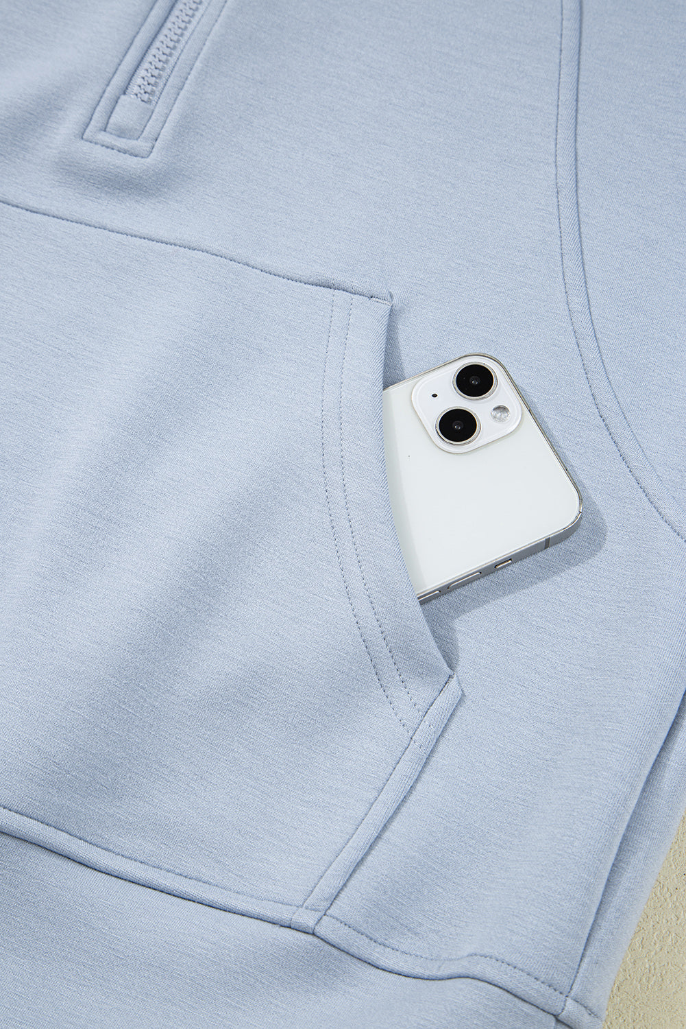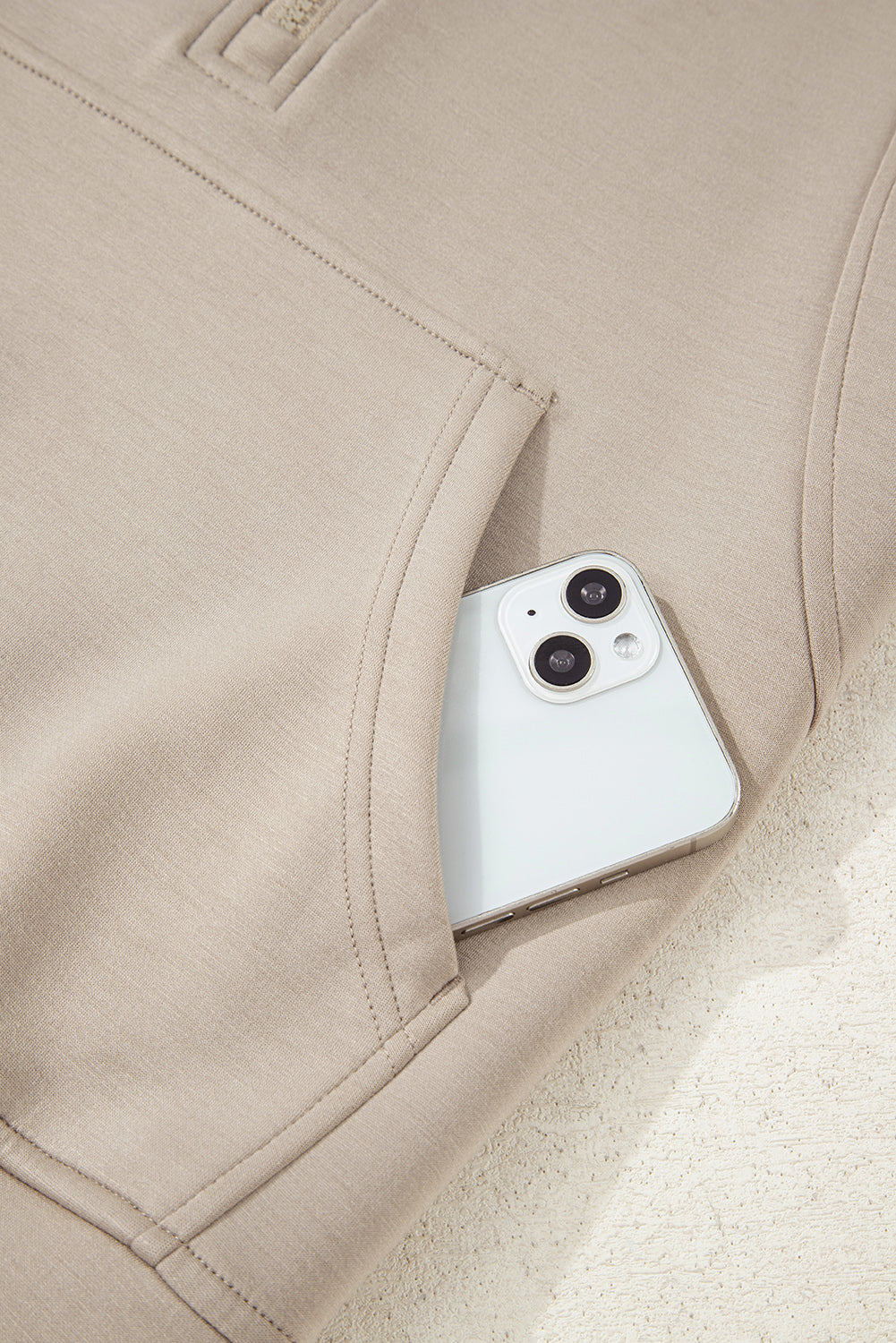 This two-piece active outfit features a hoodie with thumbhole sleeves and a kangaroo pocket, paired with loose drawstring pants that include convenient pockets. Crafted from soft, luxurious modal fabric and detailed with sleek scuba piping, it offers both comfort and a refined, sporty look—perfect for staying active with style. Polyester/Viscose/Spandex