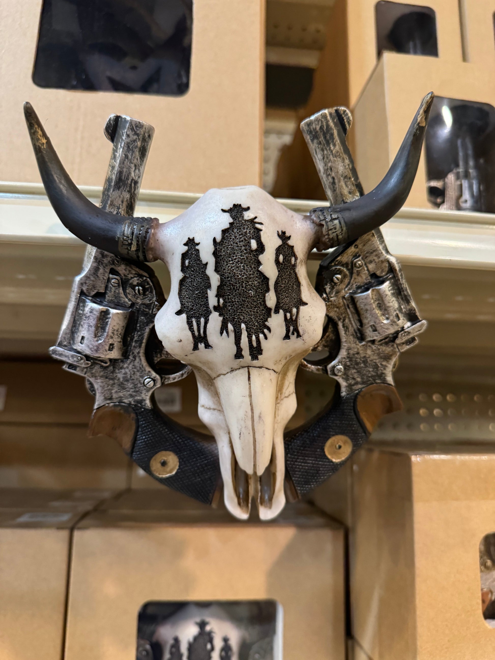 Enhance your rustic home decor with our handcrafted Western Pistol Cowskull Wall Decor. Made of high-quality resin, this 7x8" piece features stunning detail and a durable claw tooth hanger for easy installation. Add a unique touch to any room with this unique and expertly crafted wall decor.