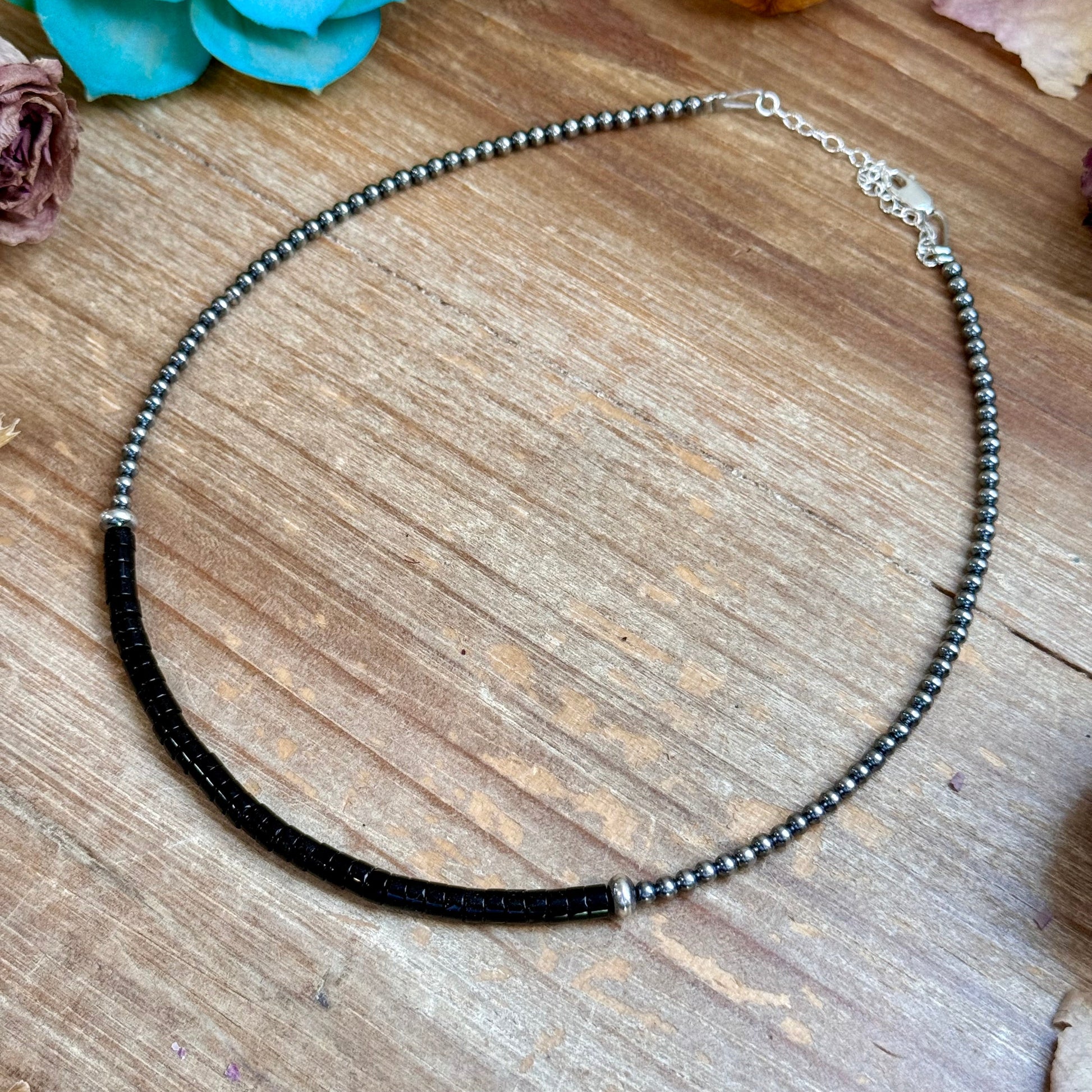 14” Black Onyx Heishi Necklace – Sterling Silver Pearls & Saucers