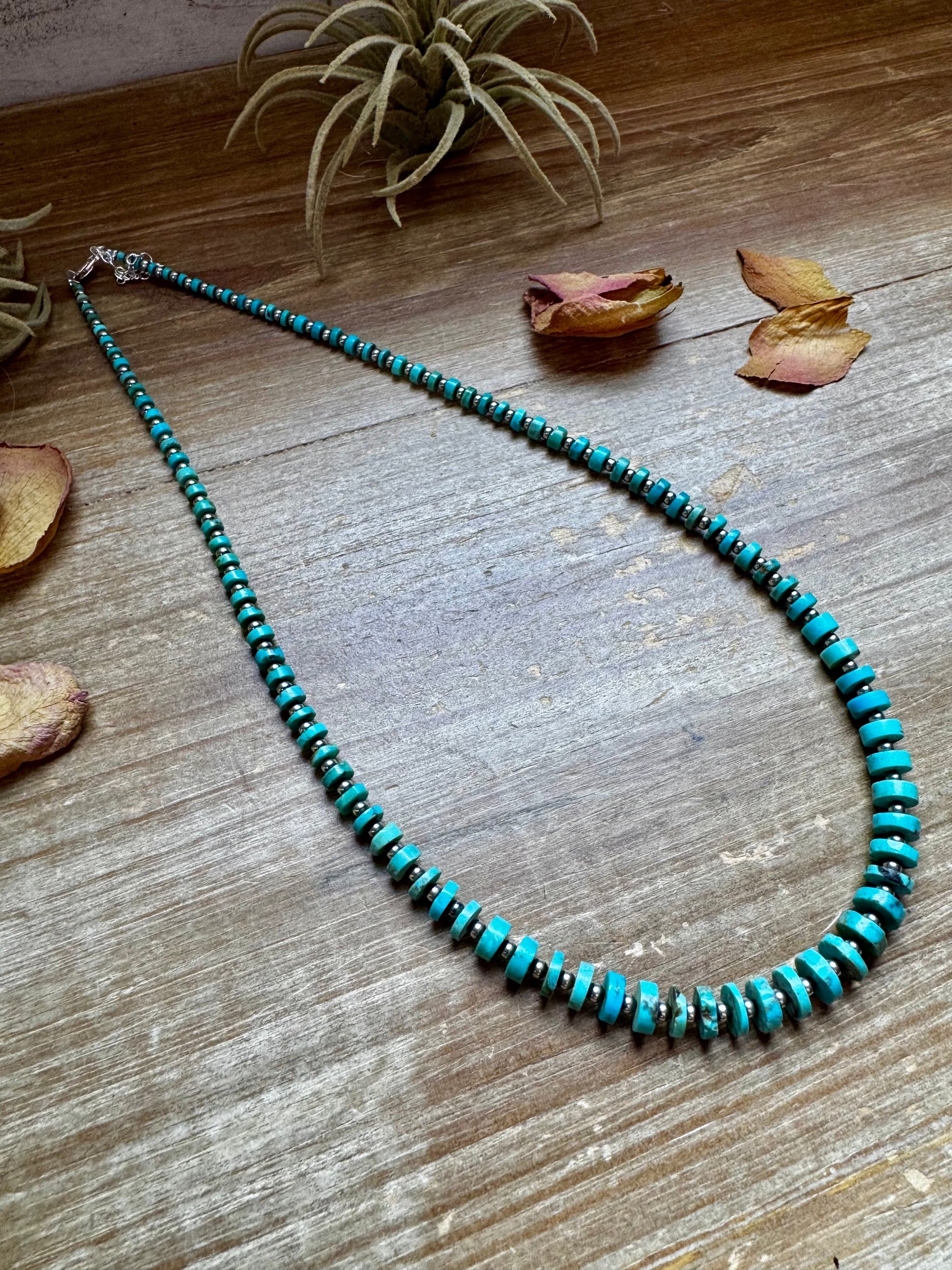This 20.5-inch necklace is handmade by us in North Texas, featuring graduated turquoise disk beads spaced with 3mm sterling silver pearls for a light, balanced, and beautifully wearable design.