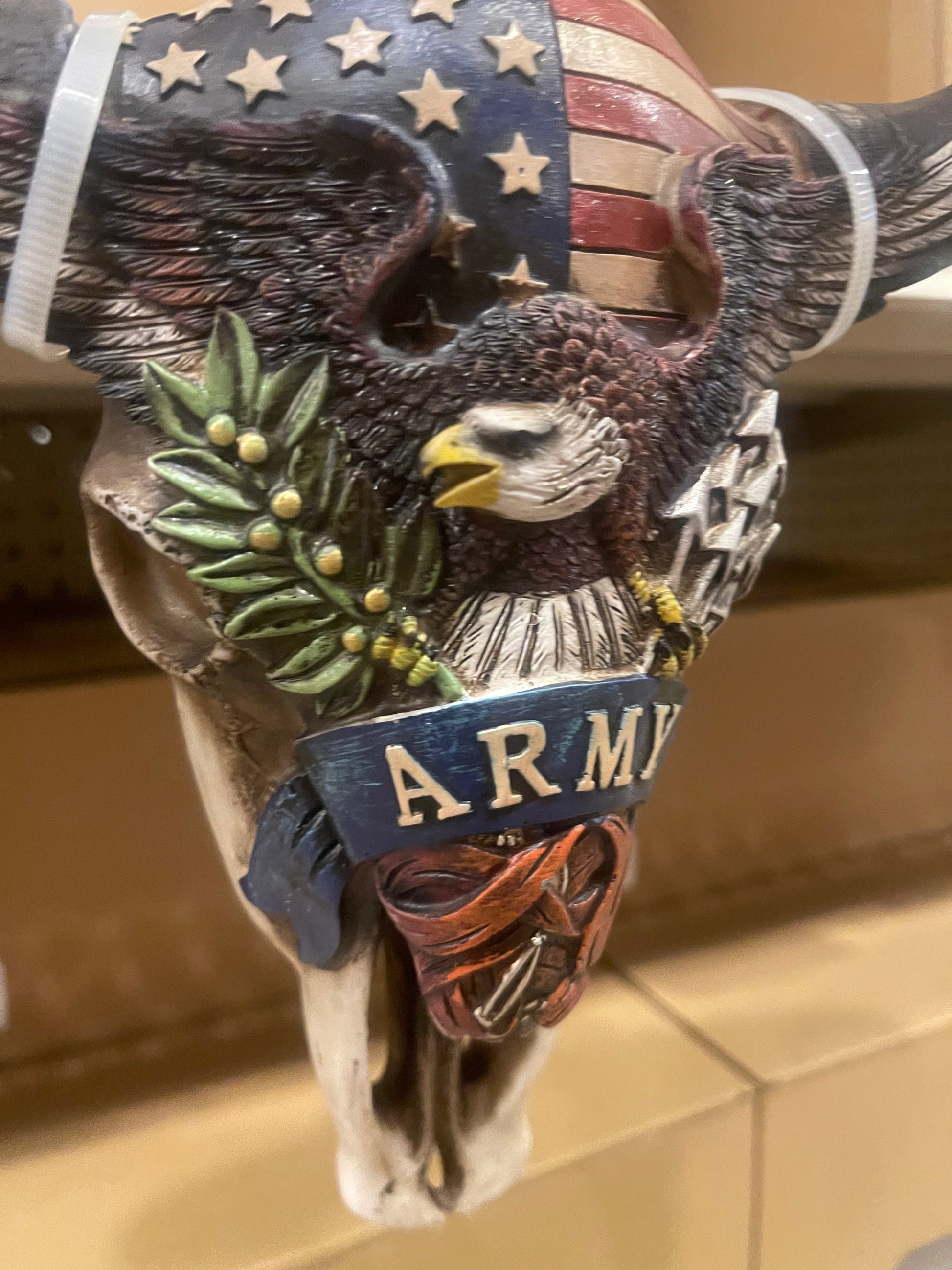 Introducing the Army Eagle Cowskull Wall Decor, a beautifully crafted piece made of sturdy resin. With a secure claw tooth hanger on the back, this wall decor is easy to display and adds a touch of rustic charm to any room. Showcase your love for nature and wildlife with this eye-catching piece.