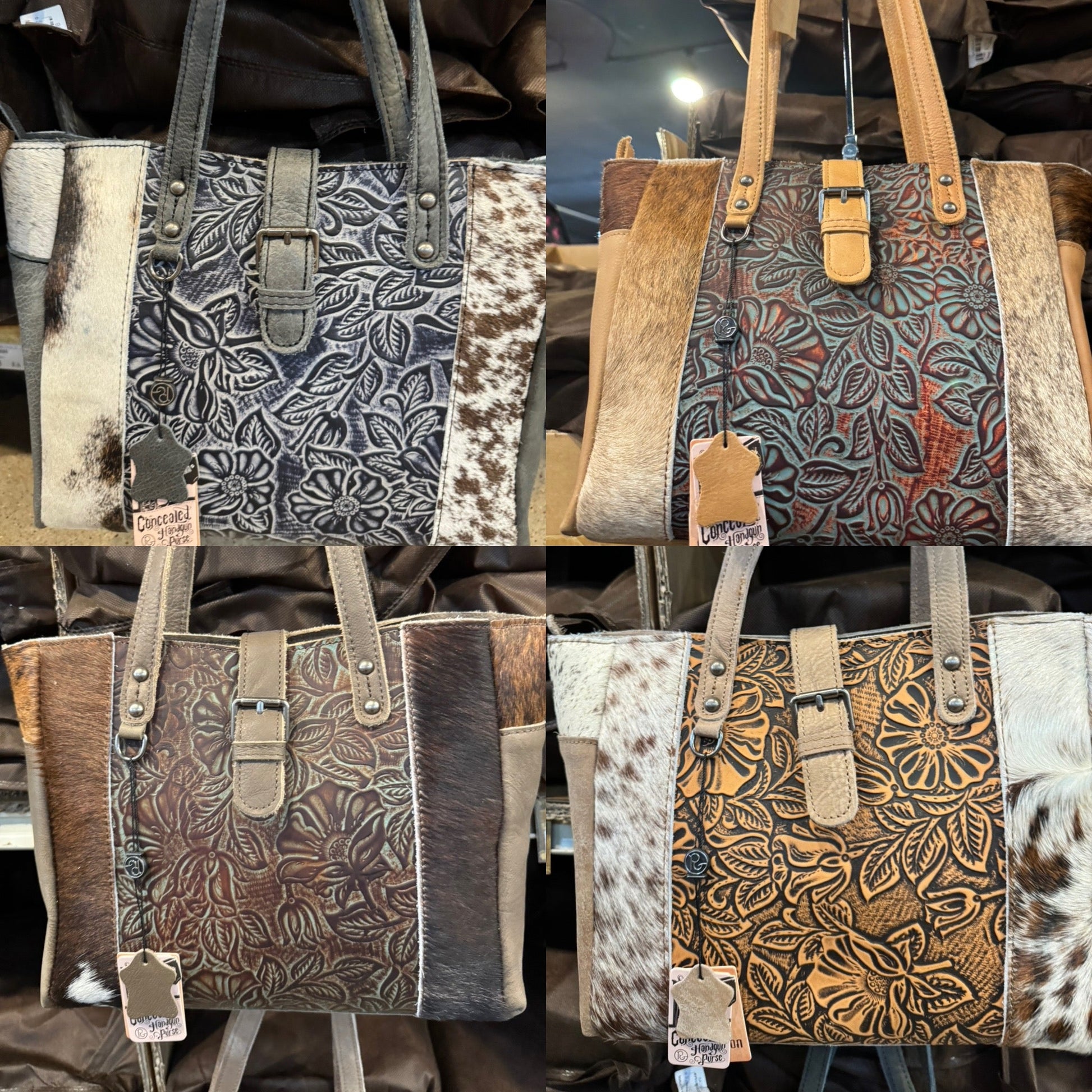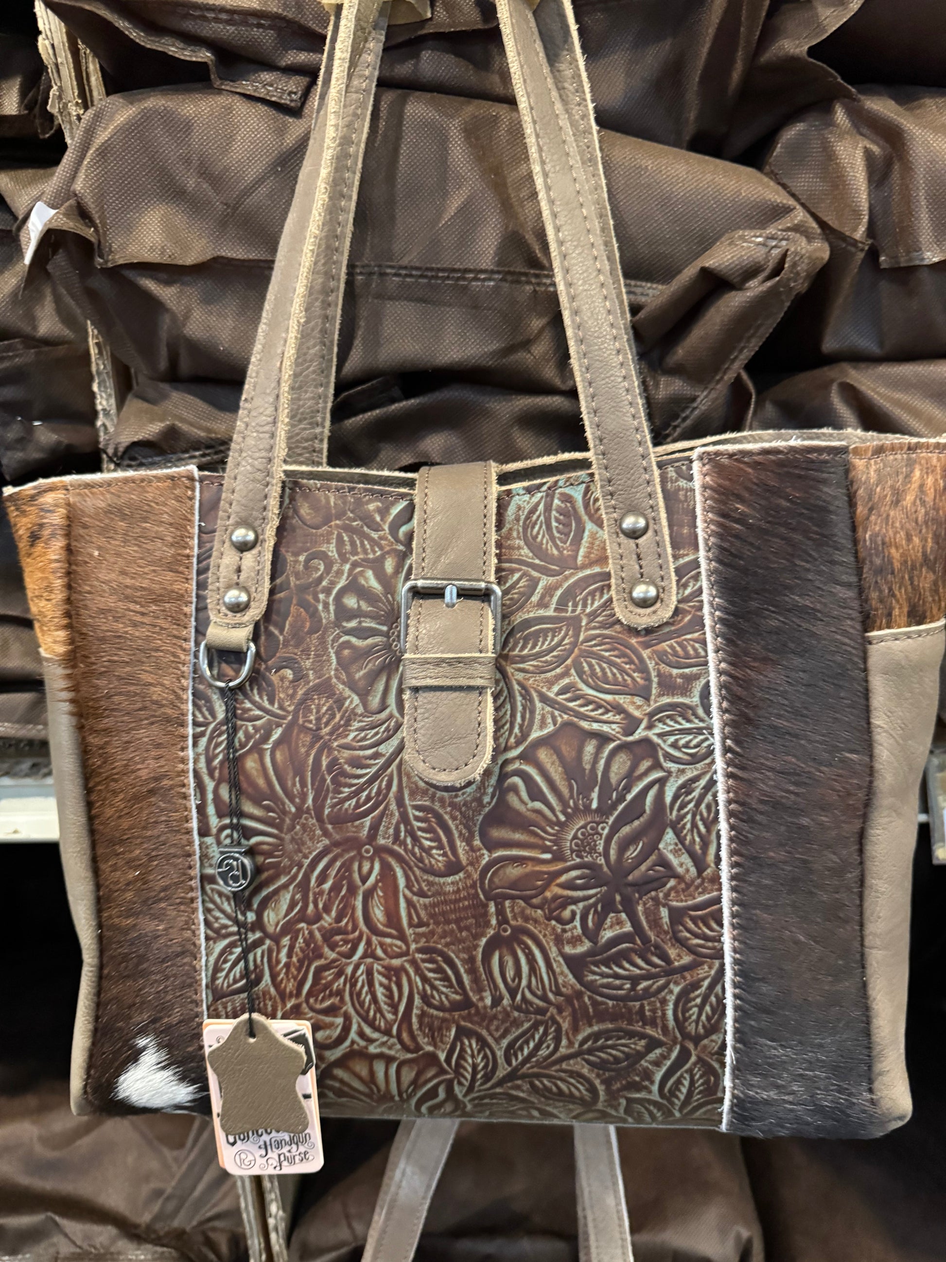 This BA2824 handbag features authentic cowhide and leather, measuring 12x9 inches. Expertly crafted with quality materials, this handbag offers durability and timeless style. Elevate any outfit with this versatile and luxurious accessory. Exact cowhide varies.