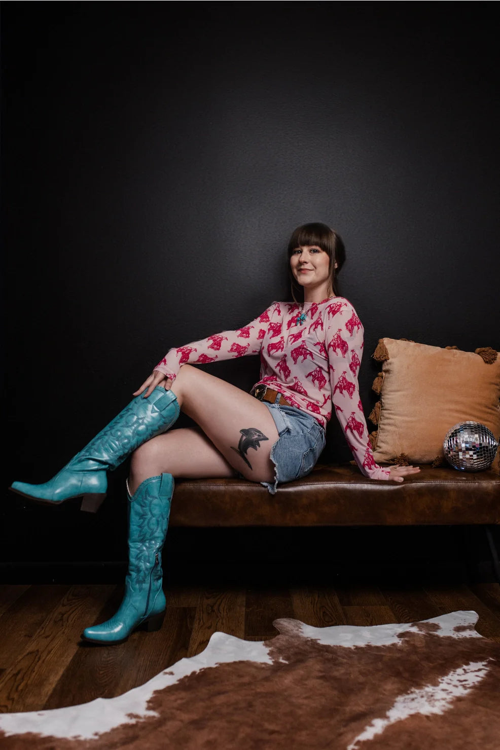 Yeehaw with this Barbie Bronco Mesh Top! Keep it rodeo chic with this bronco pink mesh top that'll have you stand out in the crowd. Pair it with your favorite high-waisted jeans or a denim skirt for a playful and stylish look. Giddy up!