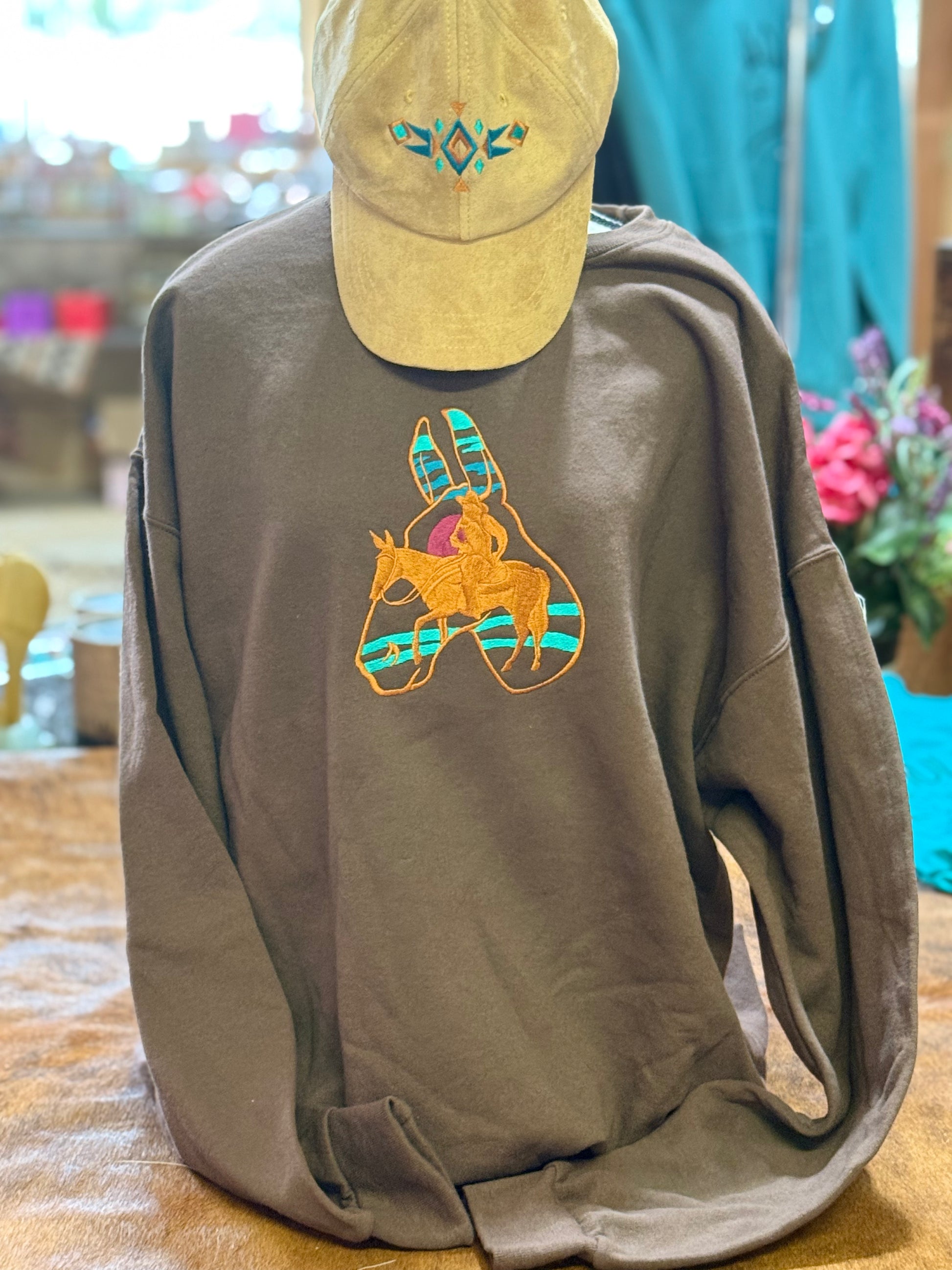 Step into southwestern charm with this Barn Star Swag Desert Southwest Mule Embroidered Crew. Featuring a playful mule design and rustic embroidery, this cozy crewneck adds a fun, spirited touch to your casual wardrobe. Perfect for those who love a bit of desert flair and a whole lot of personality.