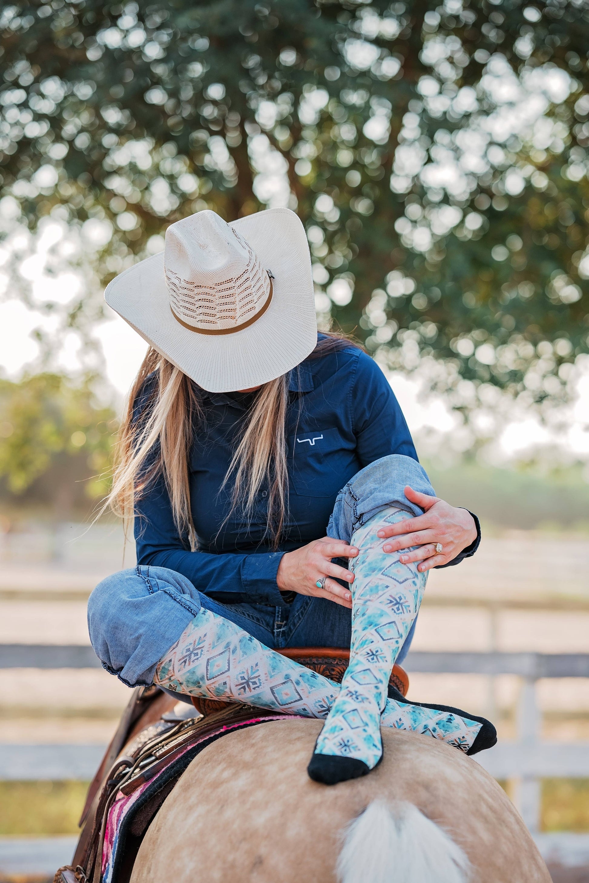Inspired by desert sunsets, Canyon Glow bring a touch of Southwestern style to your step. With turquoise, copper, and sandy tones arranged in a bold geometric pattern, these boot socks are the perfect blend of comfort and western flair.