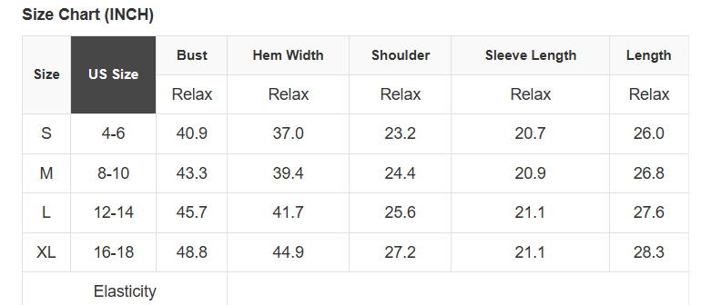 See size chart for approximate measurements.