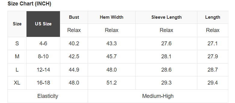 See size chart for approximate measurements.