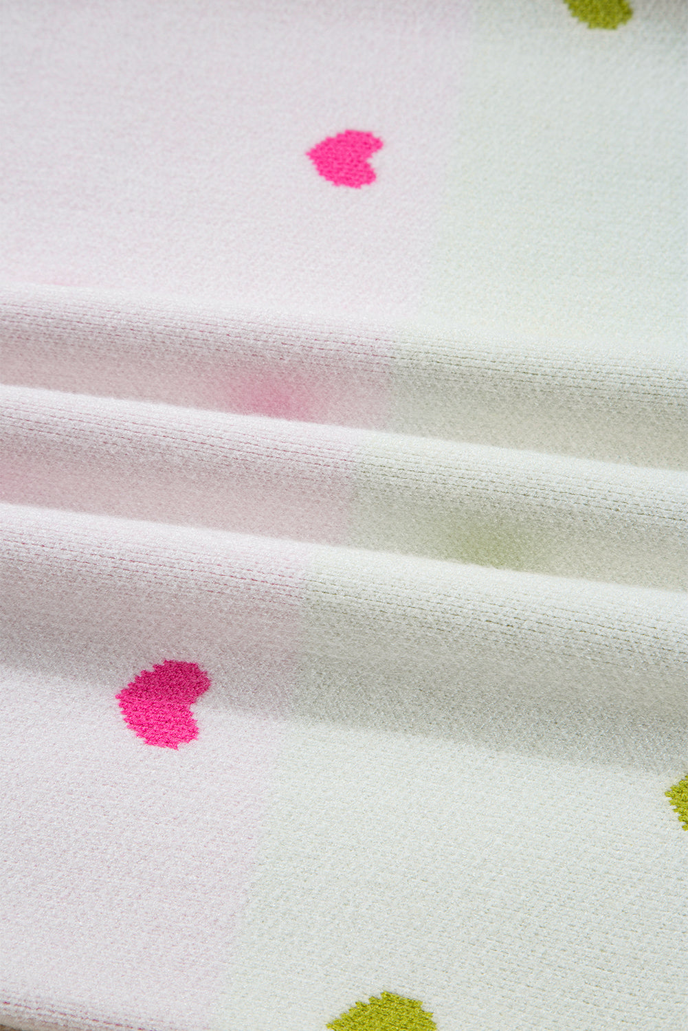 Cozy meets cute in this sweater. Its playful heart design adds charm, while the high neck keeps you snug on chilly days. The relaxed drop shoulder cut makes it perfect for layering or lounging in style. Bright colors and a comfy fit make this sweater a cheerful addition to your wardrobe. Viscose/Polyester/Poly