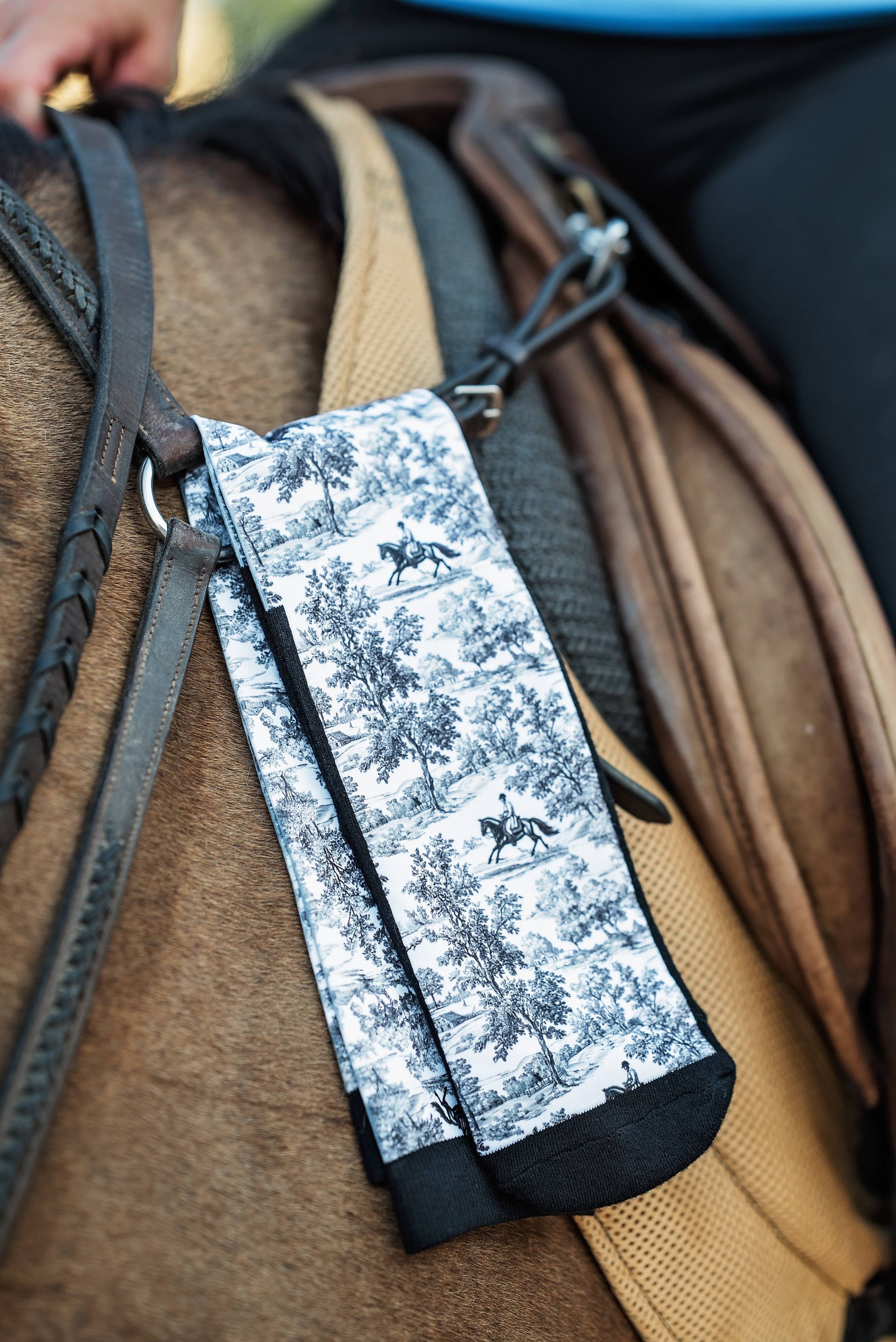 Step into timeless elegance with our Countryside Canter socks. Featuring a classic black and white toile design, these socks bring refined equestrian style to your everyday wear. Crafted with comfort and durability in mind, these are perfect for slipping under tall boots at the barn or adding a touch of sophistication to your daily barn chores.