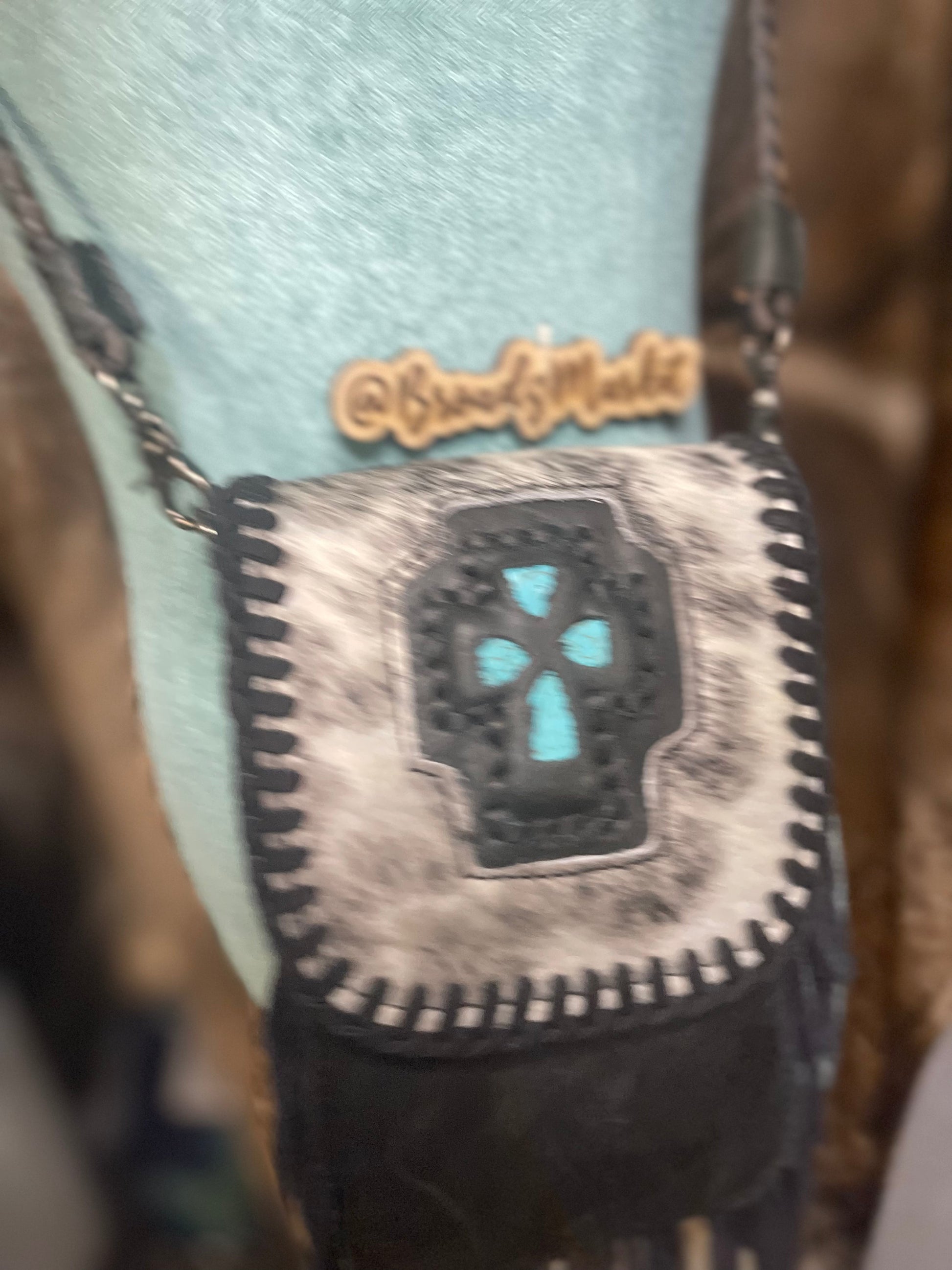 This Cowhide Fringe Crossbody Purse is crafted from authentic cowhide and features a stylish fringe detail and a convenient crossbody design. Carry your essentials in style with this stylish and practical accessory. 7.5x4.5x2.5”