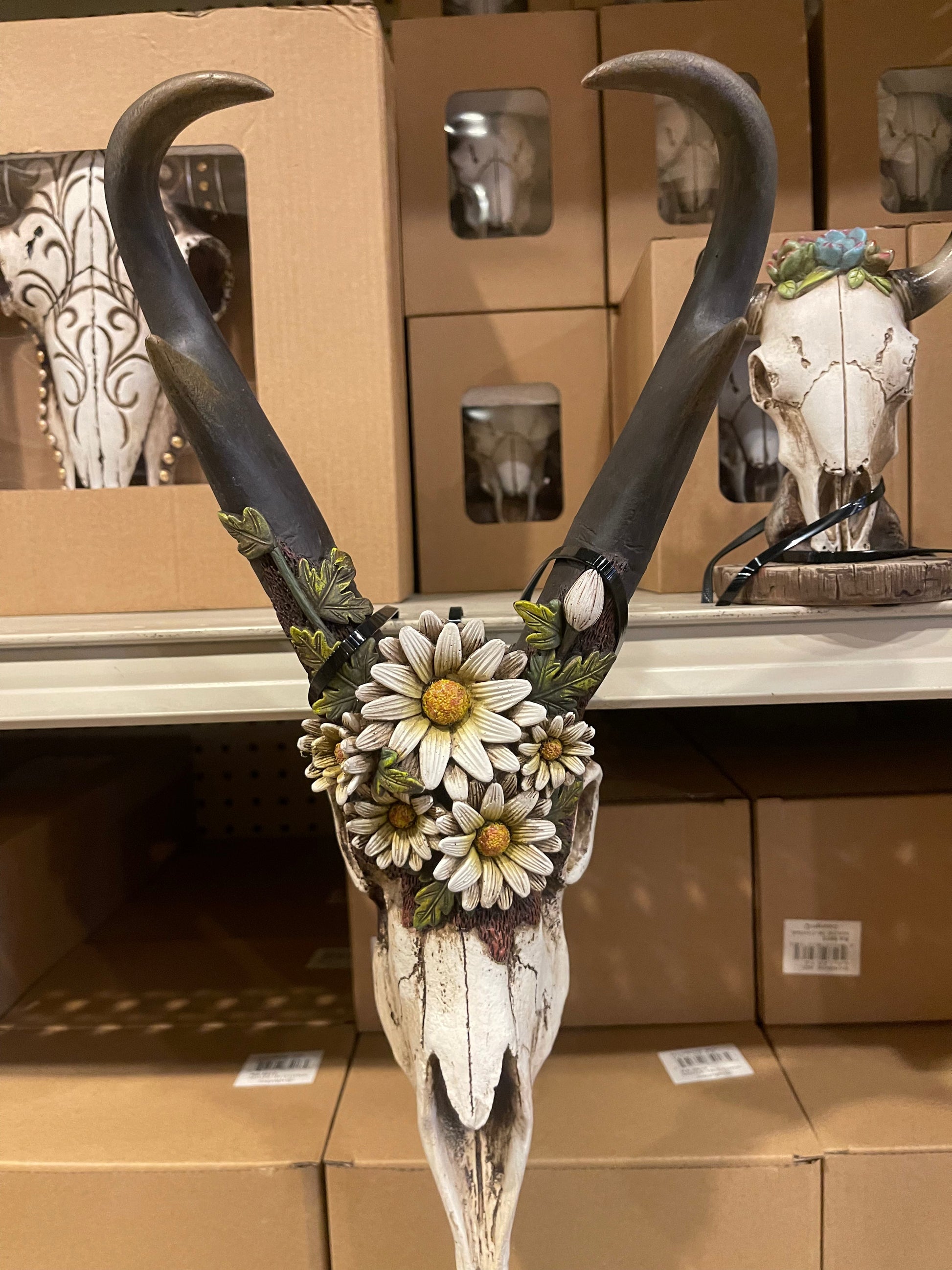 The Daisy Floral Skull is expertly crafted from resin and features a unique design of delicate daisies on a skull base. With a convenient claw tooth installed on the back, this piece can be effortlessly hung on any wall. Measuring 14x4x3 inches, it adds a touch of macabre elegance to any space.