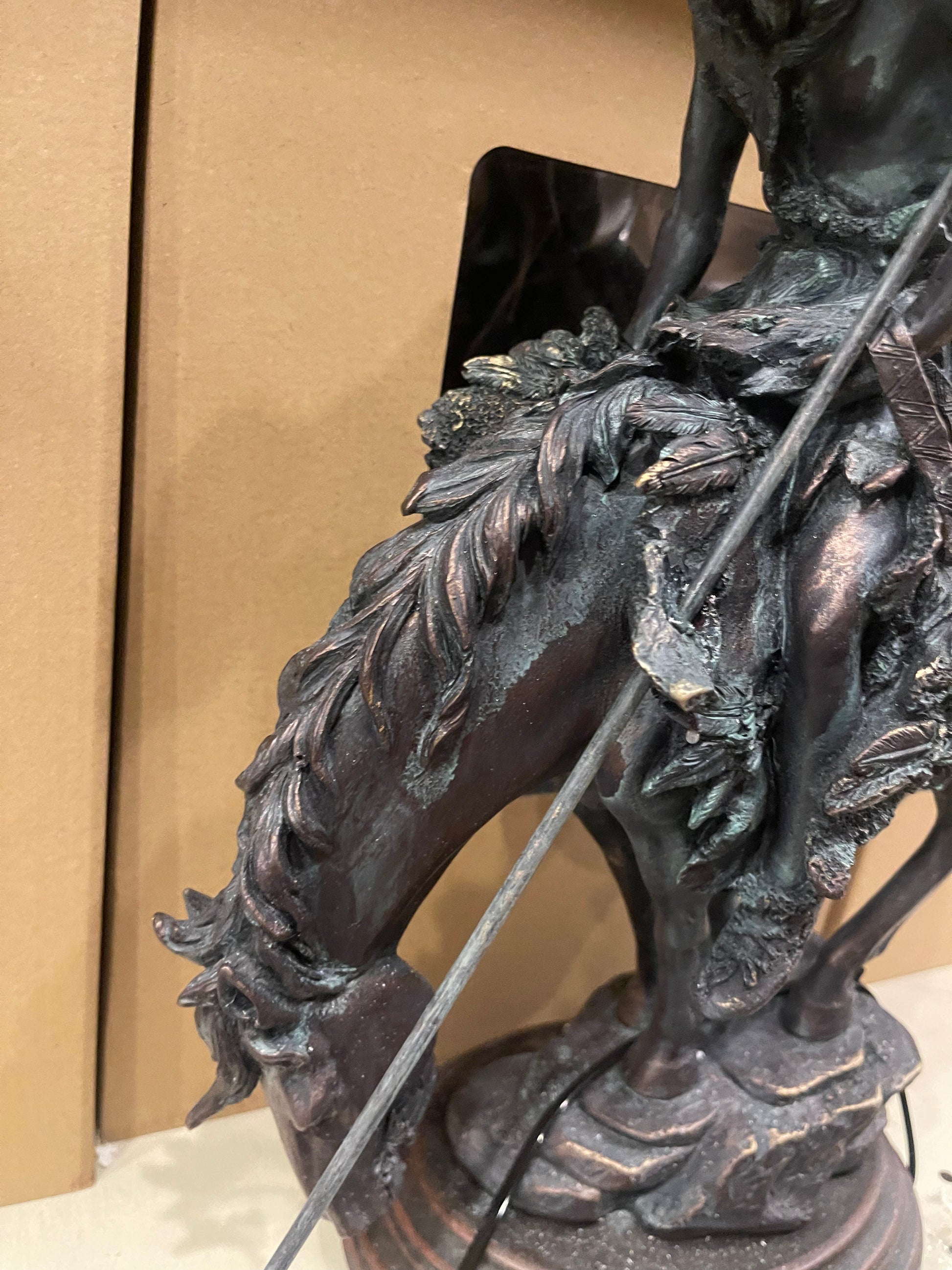 Expertly crafted with a combination of resin and bronze, the End of Trail Native Horse Statue stands at 15”x11”x6”. This beautifully detailed statue captures the strength and grace of the Native American horse, making it a meaningful addition to any home or office.