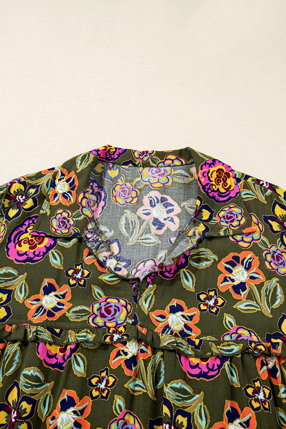 Floral Split Neck Bubble Sleeve Shift Mini Dress