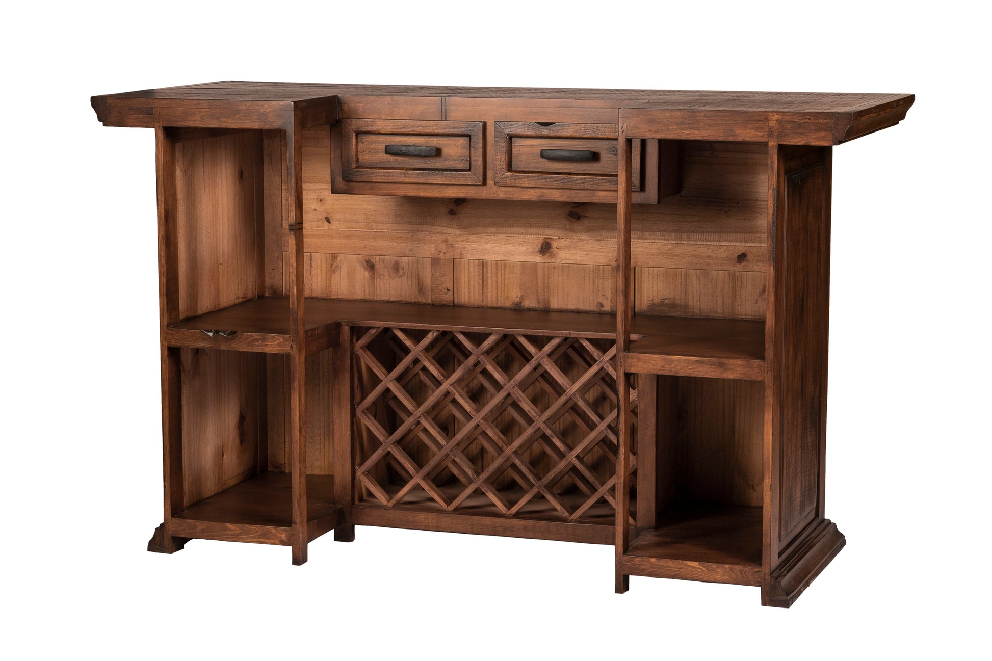 Introducing the Floresville Bar, a stylish addition to your home for entertaining in rustic elegance. This bar cabinet is designed with functionality and charm in mind, featuring a spacious interior that includes a bottle X rack for storing wine or liquor bottles neatly. Additionally, it boasts two drawers, offering convenient storage for bar accessories such as bottle openers, stirrers, or napkins.