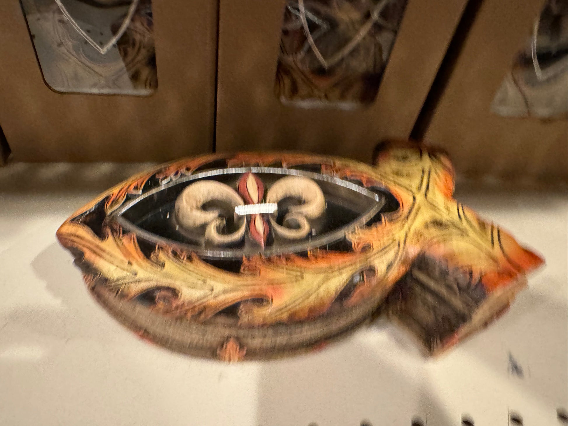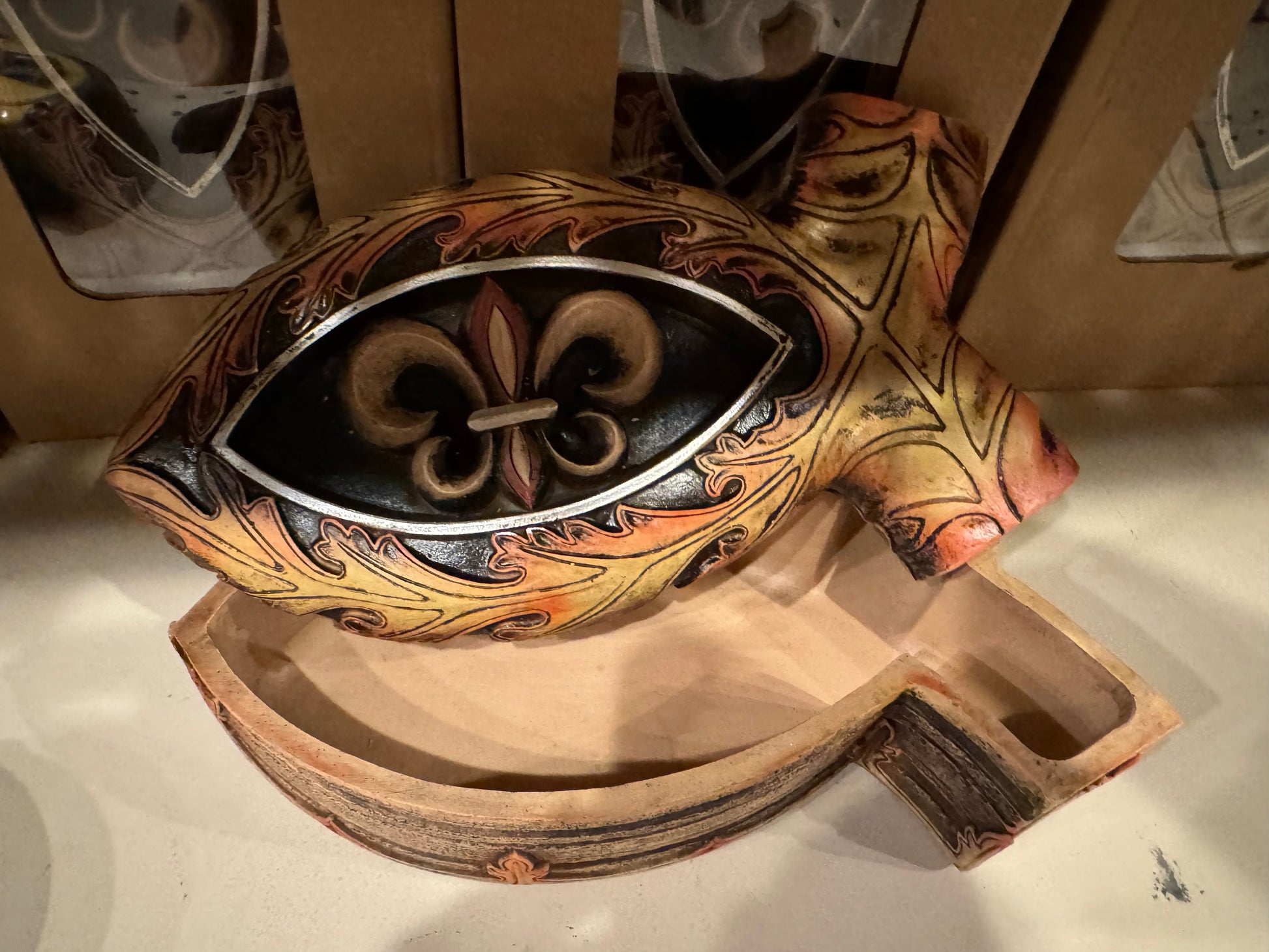 This Flour de Lys Large Trinket Box is crafted from sturdy resin, measuring 9 inches in length. This elegant box is perfect for storing small keepsakes or jewelry. Its durable construction ensures long-lasting use and adds a touch of sophistication to any room.