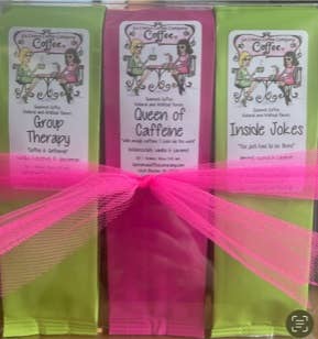 Girlfriends Trio Coffee in a acetate box and ribbon! Flavors Include: GROUP THERAPY- Crumb Cake (cinnamon, vanilla, hazelnut) INSIDE JOKES- Brazilian Sunset (almond, coconut, and caramel) QUEEN OF CAFFEINE- Highlander Grogg (butterscotch, caramel, vanilla) Made with love in Cincinnati, Ohio