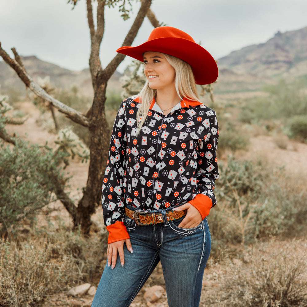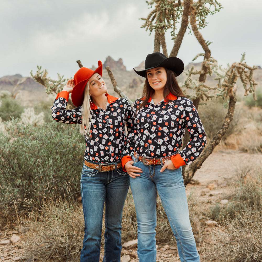 Our button downs have been thoughtfully designed for the active cowgirl. Our main warehouse is out in the Arizona Desert where it can get as hot as 125 degrees in the summer and our owners, Anastasia & Brad, are originally from Maryland where it can get to a swampy 100% humidity with temps between 95-100. They are no stranger to being hot and uncomfortable at jackpots, barrel races, ropings, rodeos, and horse shows. When Anastasia set out to design our button downs she had three main goals: reasonably priced, a comfortable fabric, and a reliable fit. After 3 years she finally found what she was looking for and brought our button downs to market. All of our button downs are made out of a soft, lightweight stretch satin that has a subtle sheen to it. This makes them airy and comfortable even during the hottest days. They are stretchy enough that you can easily push your horse home or throw a rope without worrying about hulking out of your shirt or feeling restricted in your movement. They are also wrinkle resistant as long as you avoid balling them up and throwing them under that pile of tack we know is on the floor of your trailer. With our button downs you can look good, feel good, and still have enough money for entry fees even after you buy a whole new wardrobe for the weekend.