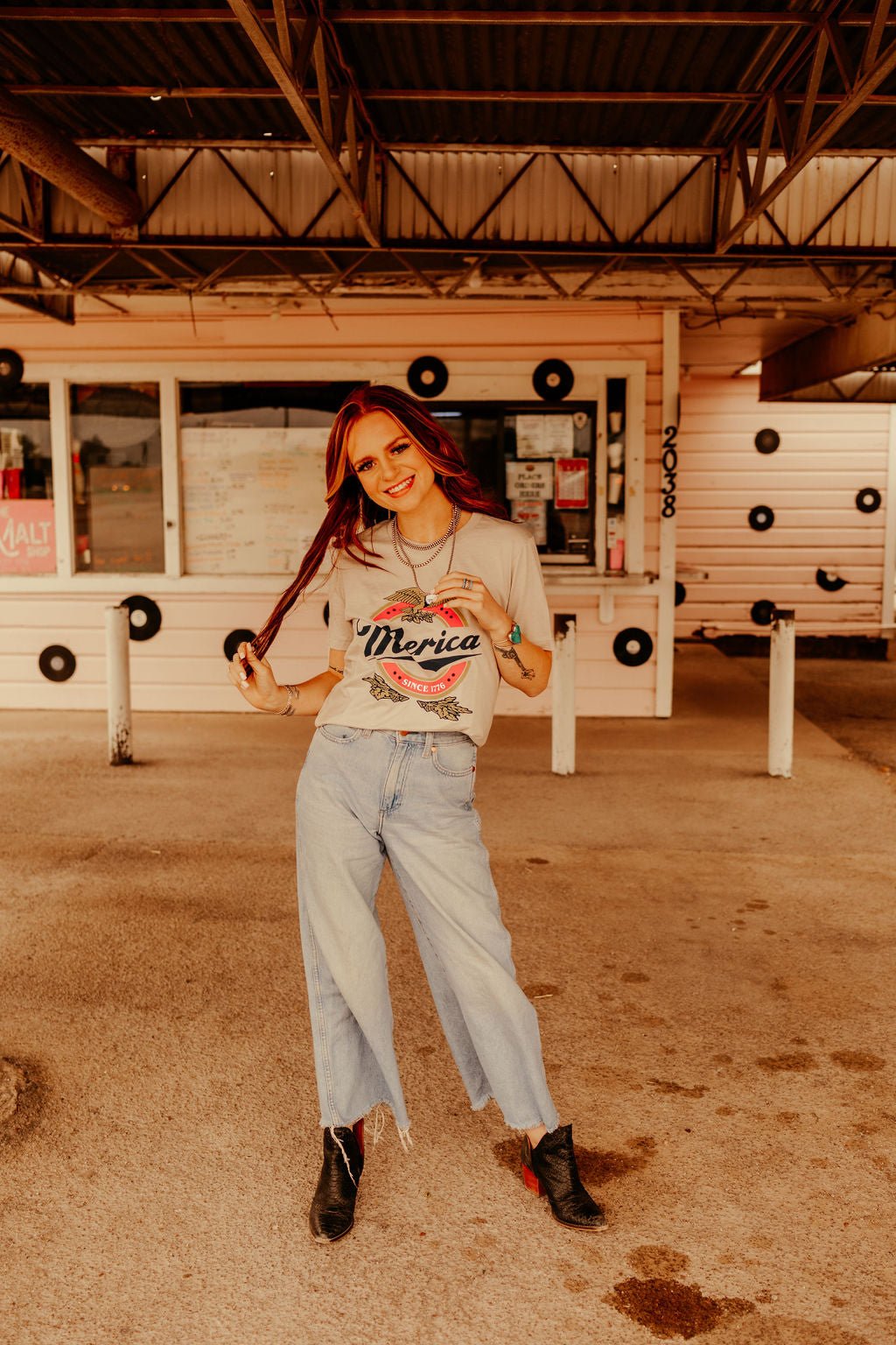 Is there anything that goes better together than beer and merica? We don't think so. That's why we have our Merica Beer t-shirt. Flaunt your patriotic style with this faded print tee that reps two of our favorite things. Tuck it into a pair of denim shorts for a look that is sure to catch some eyes!