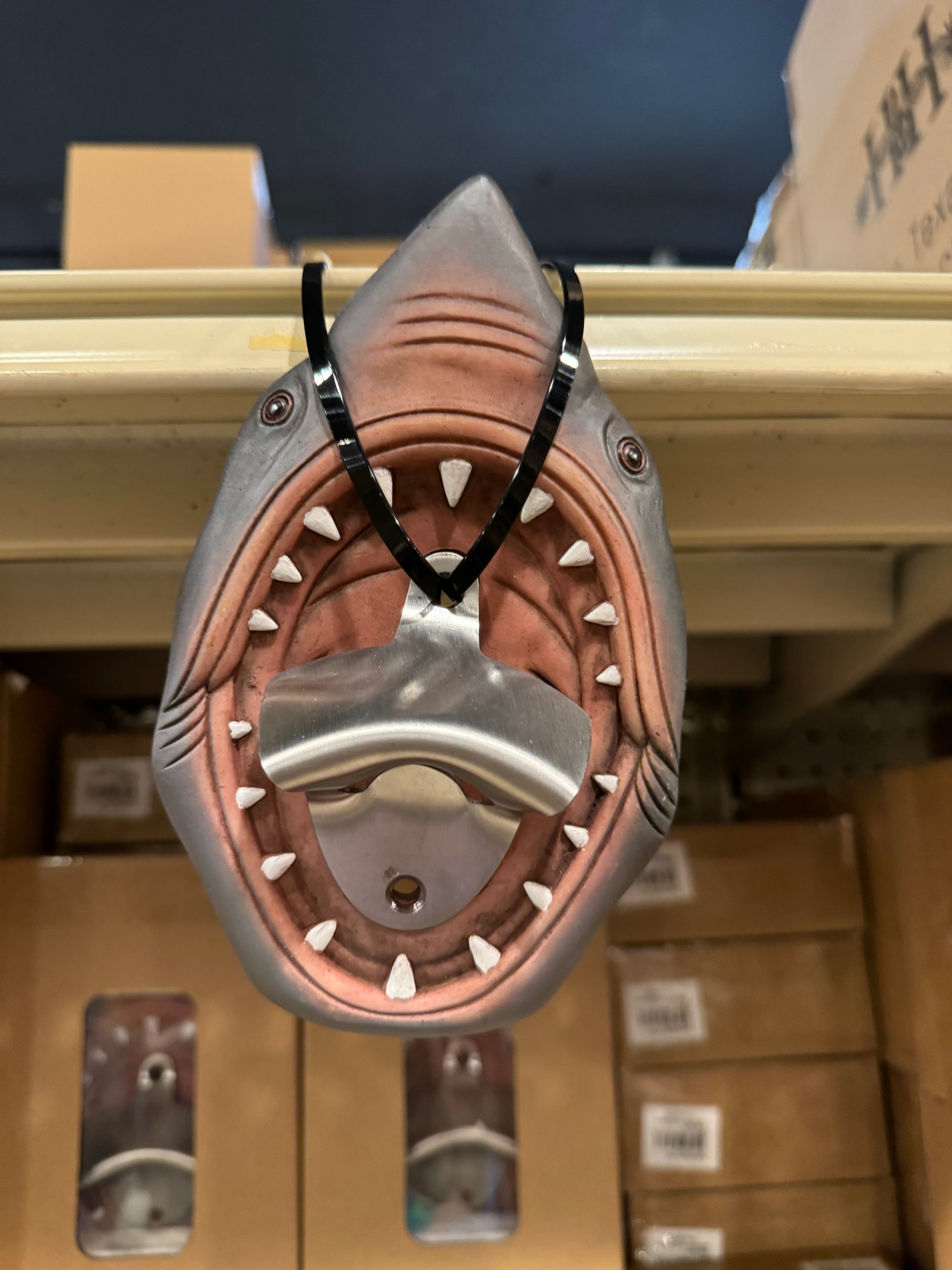 As a product expert, enjoy the convenience of the durable Shark Bottle Opener. Made from resin and metal, this wall mounted opener comes with included hardware for easy installation. Its reliable design ensures lasting use, making it a must-have for any home or bar.