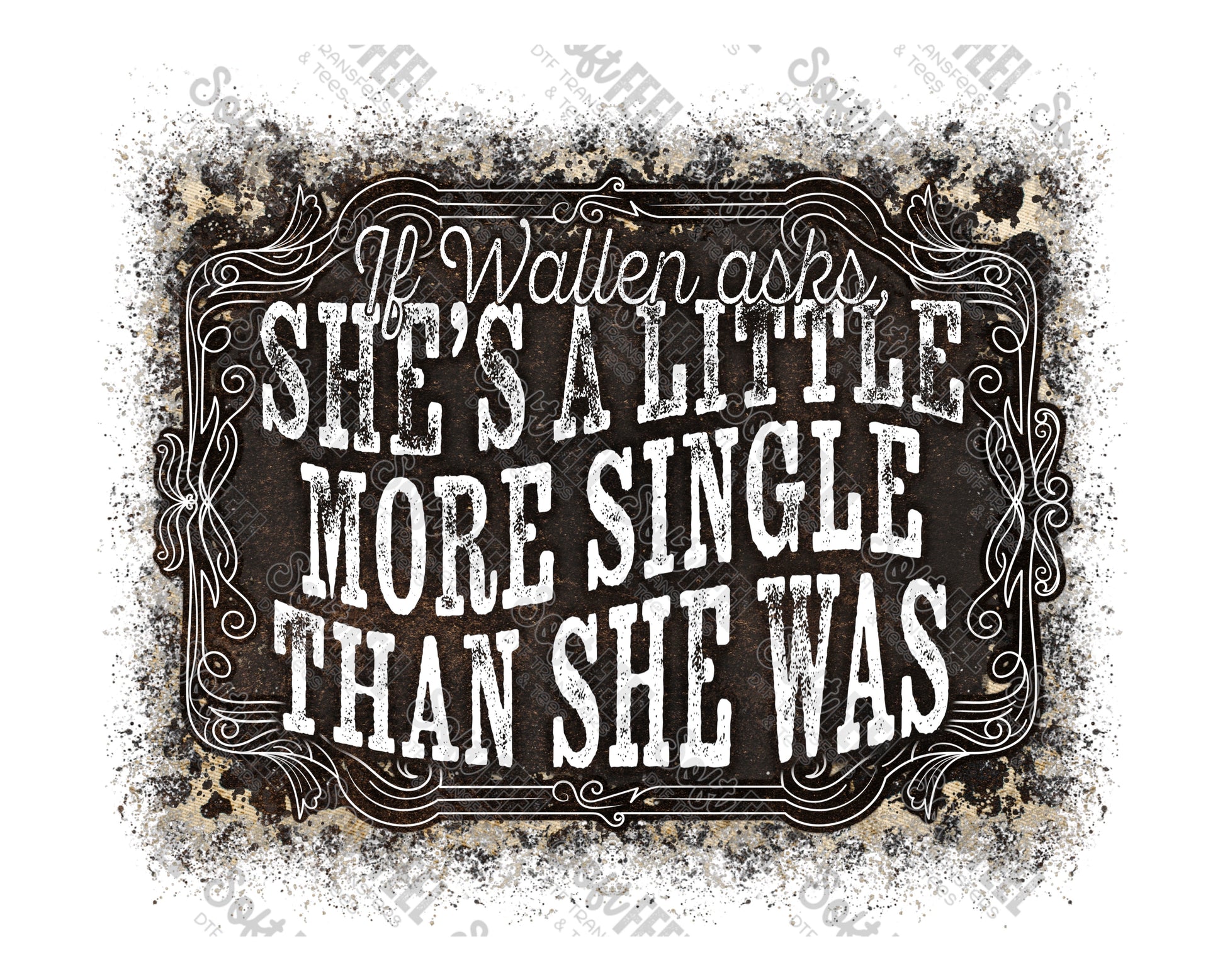 She's A Little More Single Than She Was - Country / Western / Music - Direct To Film Transfer / DTF - Heat Press Clothing Transfer