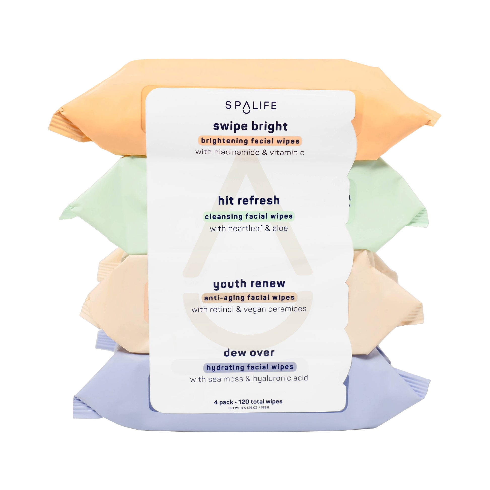 A facial wipes 4-Pack with each variety targeting a specific skin concern: anti-aging, cleansing, brightening, & hydrating. Your trusted facial wipes just got a major glow up! Part skincare, part cleansing makeup remover, these wipes come in a 4 pack-bundle of 30 each: hit refresh (cleansing, with heartleaf & aloe); swipe bright (brightening, with vitamin C & niacinamide) dew over (hydrating, with sea moss & hyaluronic acid); and youth renew (with retinol & vegan ceramides). Why We Love it: ● Aloe: helps cool, soothe, & hydrate unhappy skin ● Niacinamide: targets dark spots & discoloration ● Hyaluronic Acid: holds 1000x its weight in water ● Retinol: helps boost cellular turnover for smooth-looking skin LET'S DO THIS: 1. Peel away the seal to remove a wipe 2. Gently wipe over your face & neck. 3. Make sure to reseal the package after each use to keep wipes fresh. 4. Use in the AM or PM. Repeat as necessary.