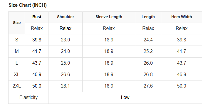 See size chart for approximate measurements.