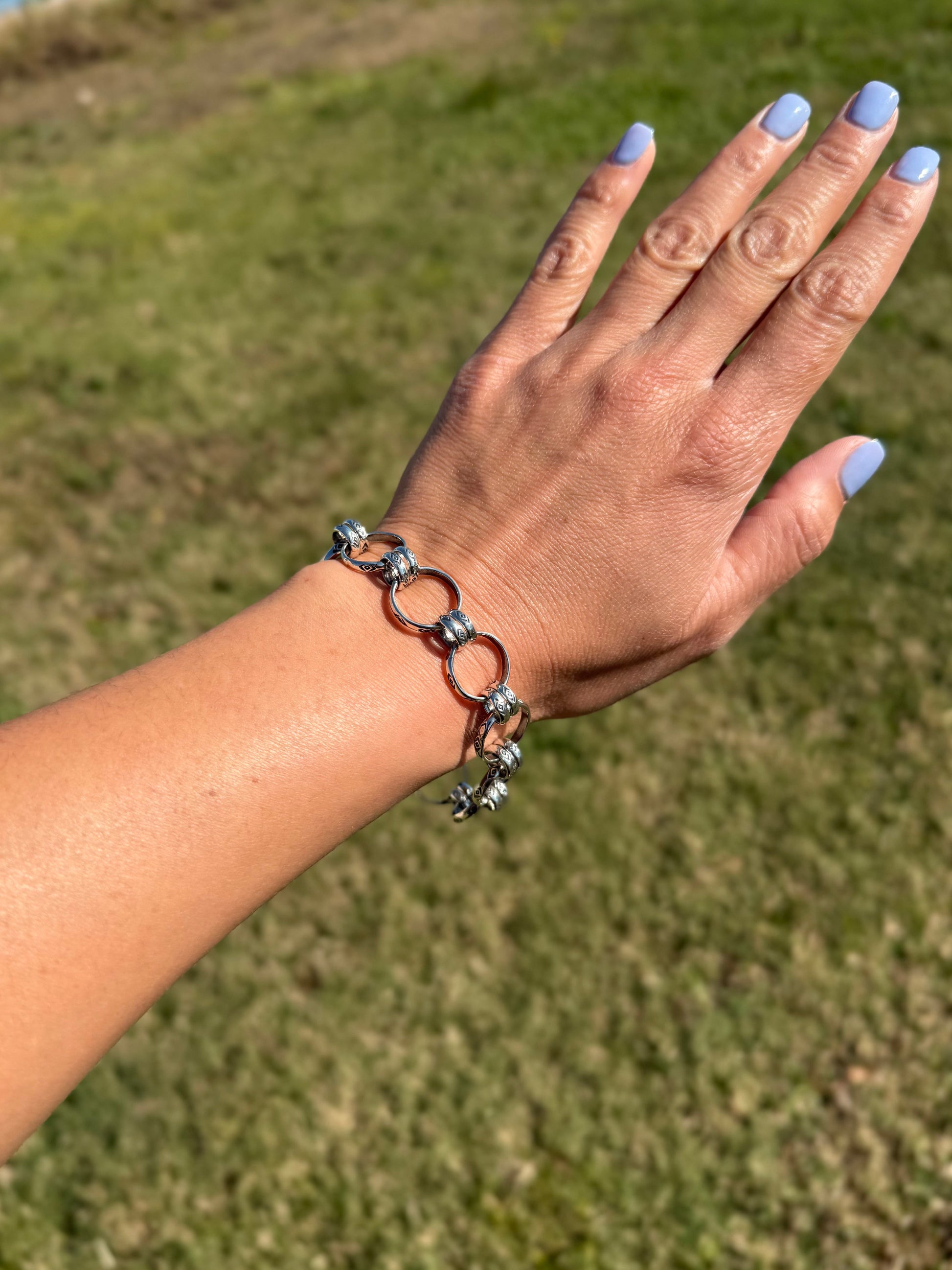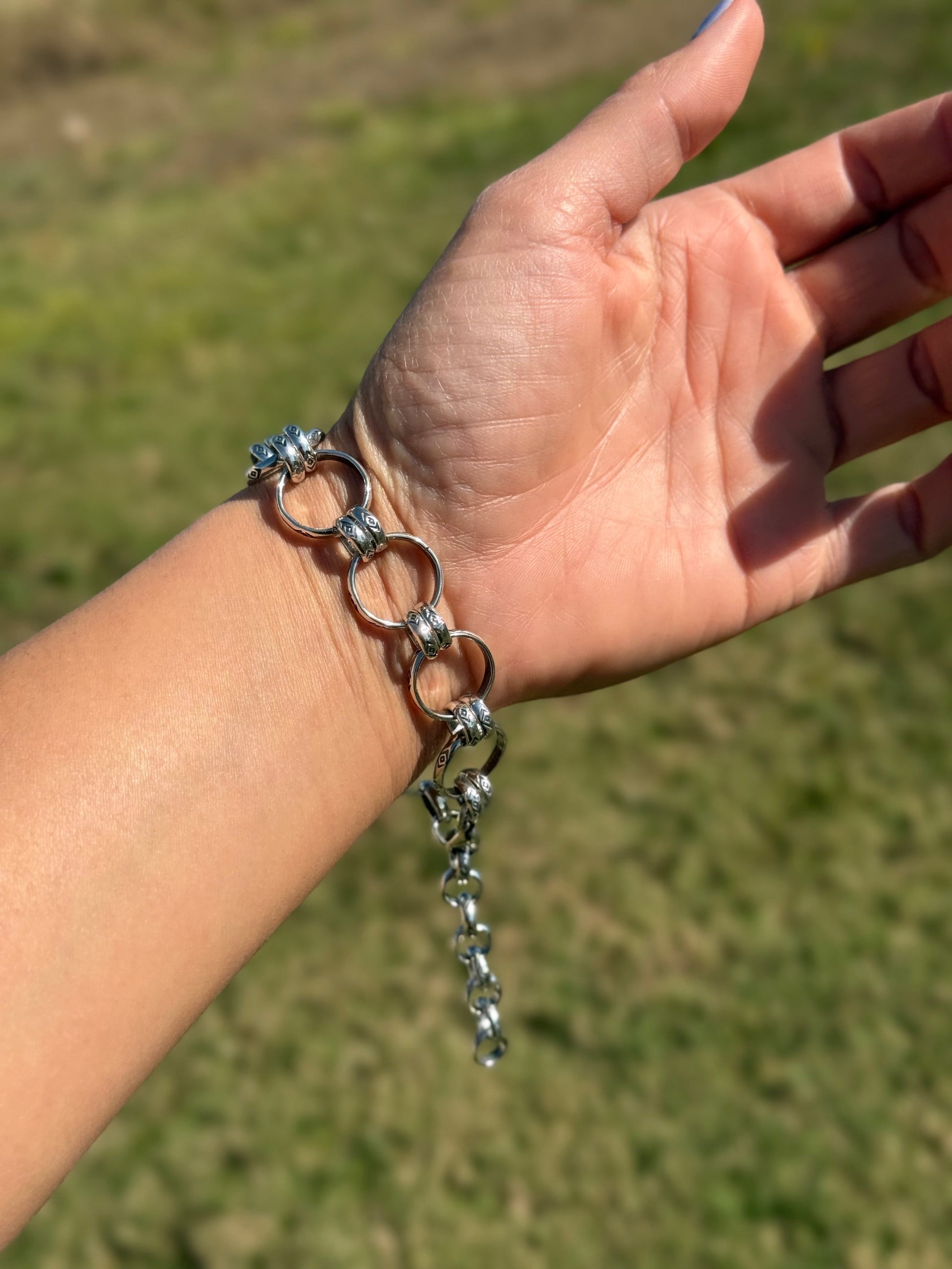 This sterling silver charm chain bracelet by artist Jason Ogg features the signature Medicine Man Eye pattern hand-stamped along each link. Designed to fit a 7-inch wrist with a 2-inch extender, this piece combines durability with timeless Western detail. Each link is individually crafted and polished for a clean, bright silver finish — perfect for wearing alone or adding your favorite charms.