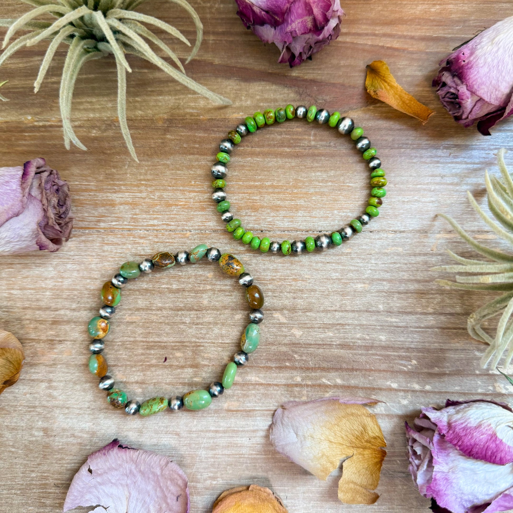 terling Silver 5-7mm Machine Bead Green Mohave Stretchy, Will Fit Up To 7.5” Wrist, Artists Colby + Addalie Ogg