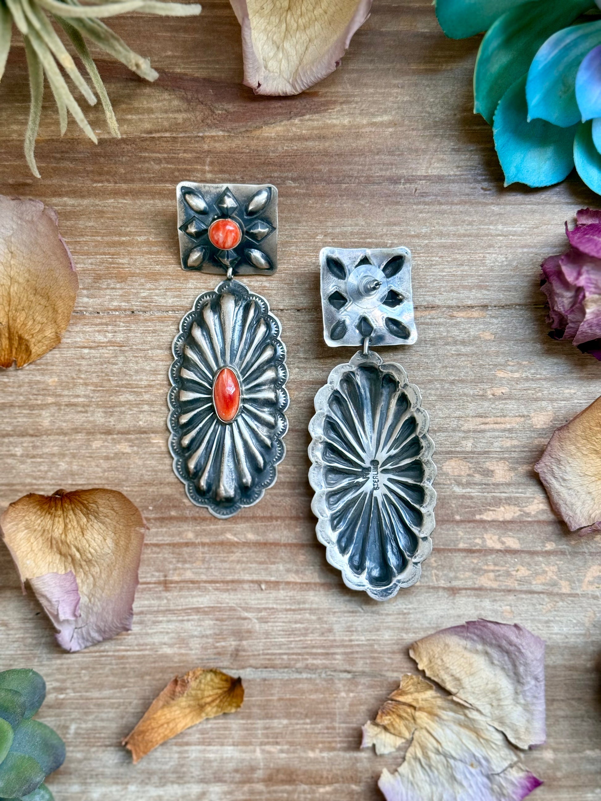 Featuring rich orange Spiny Oyster stones set in solid sterling silver, these earrings offer bold color, elegant movement, and classic Southwestern artistry.