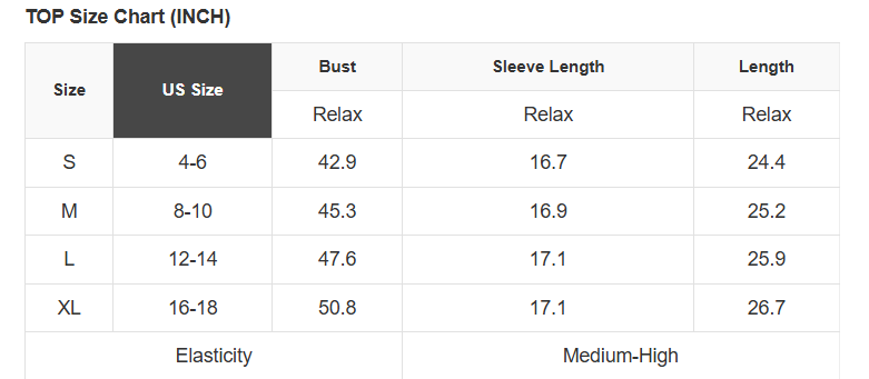 See size chart for approximate measurements.