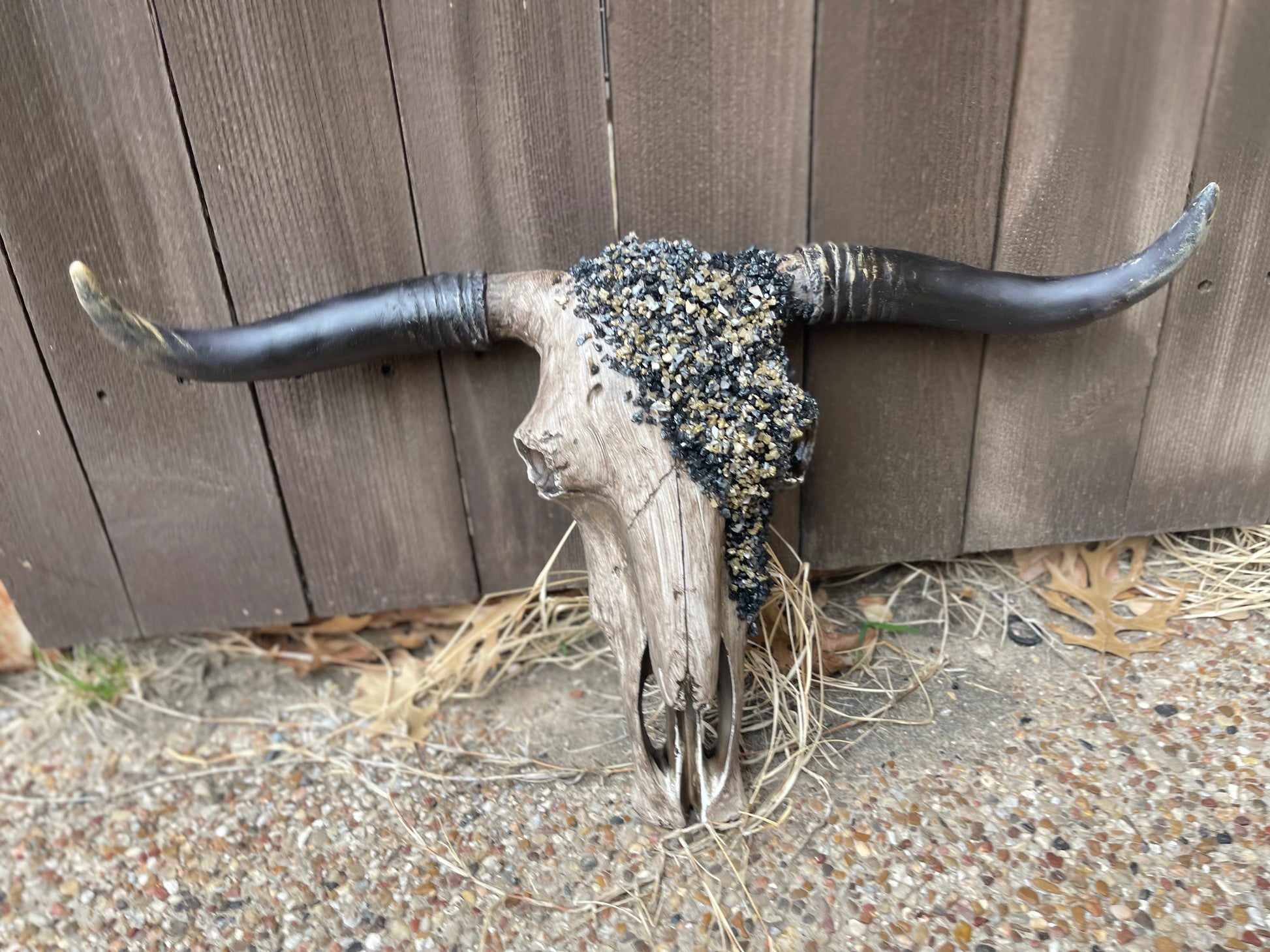 this Cowskull is the perfect statement piece for any cowgirl or southwest enthusiast. Handmade from durable resin, it measures 20x12" and will add a touch of rustic charm to any space. Please allow 5-20 business days for completion.