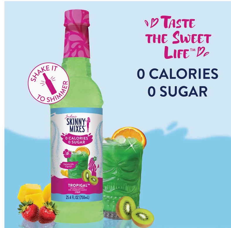 Introducing Tropigal Jordan Skinny syrup: the sugar-free and calorie-free way to add a tropical twist to your favorite drinks! With zero sugar and zero calories, you can indulge without any guilt. So go ahead, add a splash of Tropigal to your day!