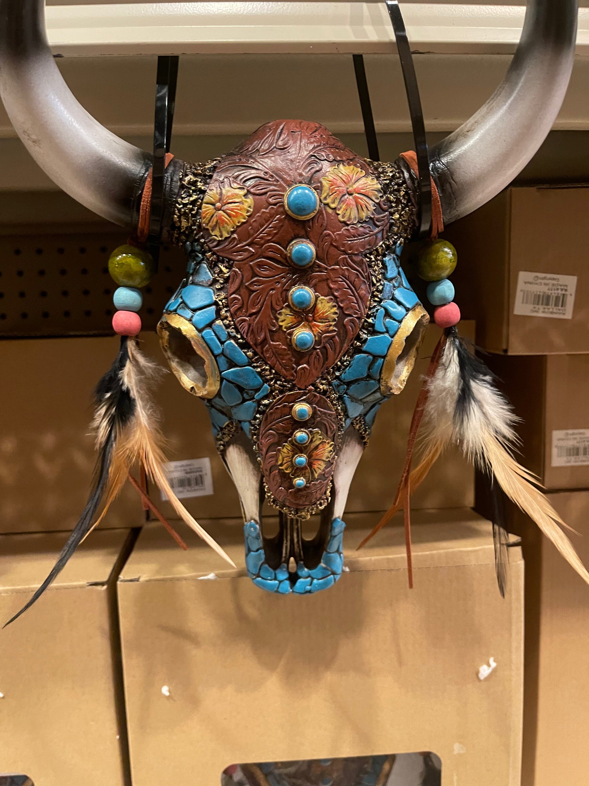 Crafted with a stunning resin cow skull and sized at 13x8.5 inches, this turquoise leather feather cowskull adds a touch of rustic charm to any space. Add a southwestern touch to your home décor with this unique and beautifully designed piece.