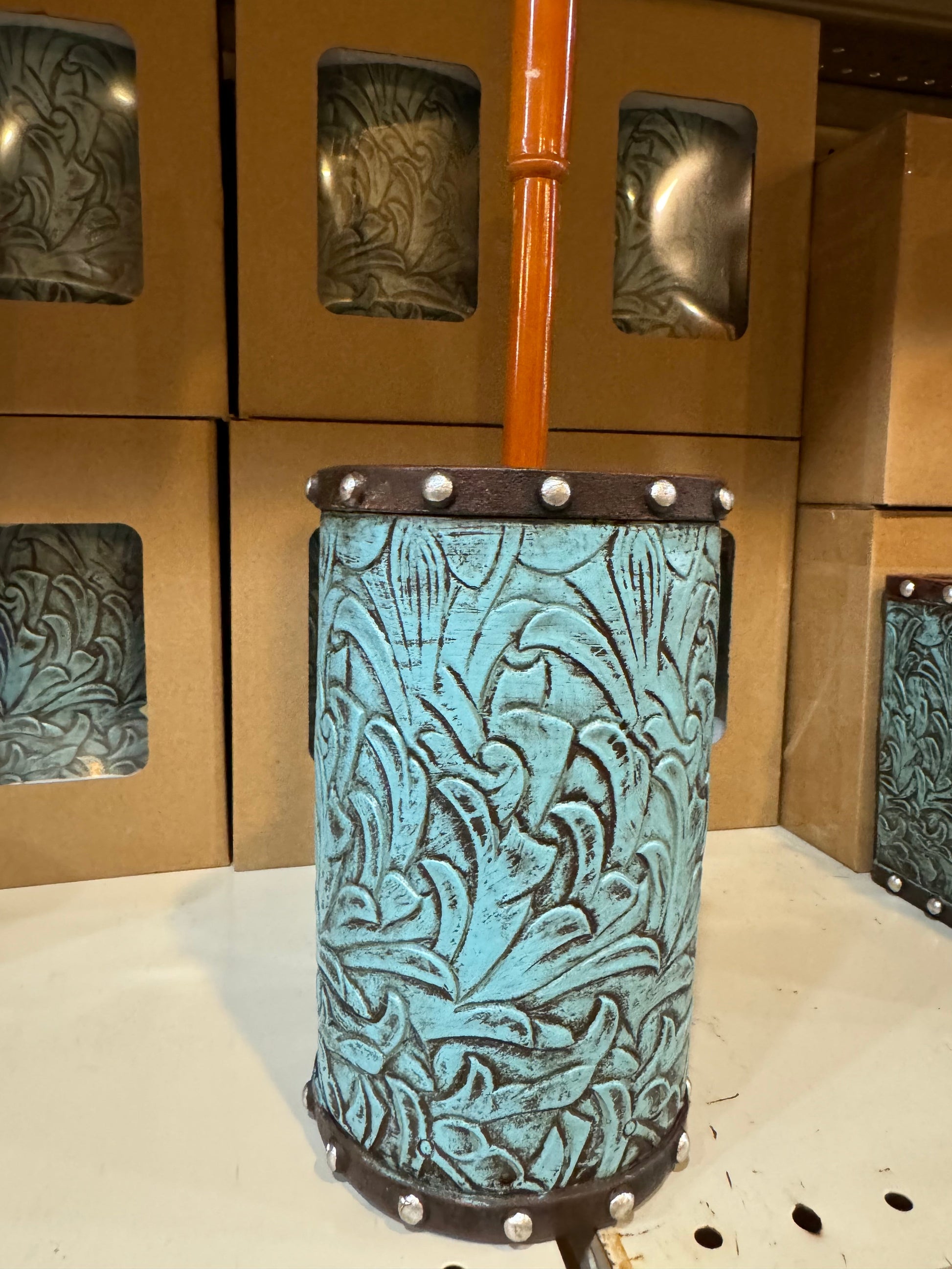 Expertly crafted from durable tooled resin, this Turquoise Tooled Toilet Brush & Holder adds a touch of elegance and functionality to any bathroom. Measuring 7x4.5 inches, this brush and holder set is the perfect size for daily use while also adding a decorative element to your space.