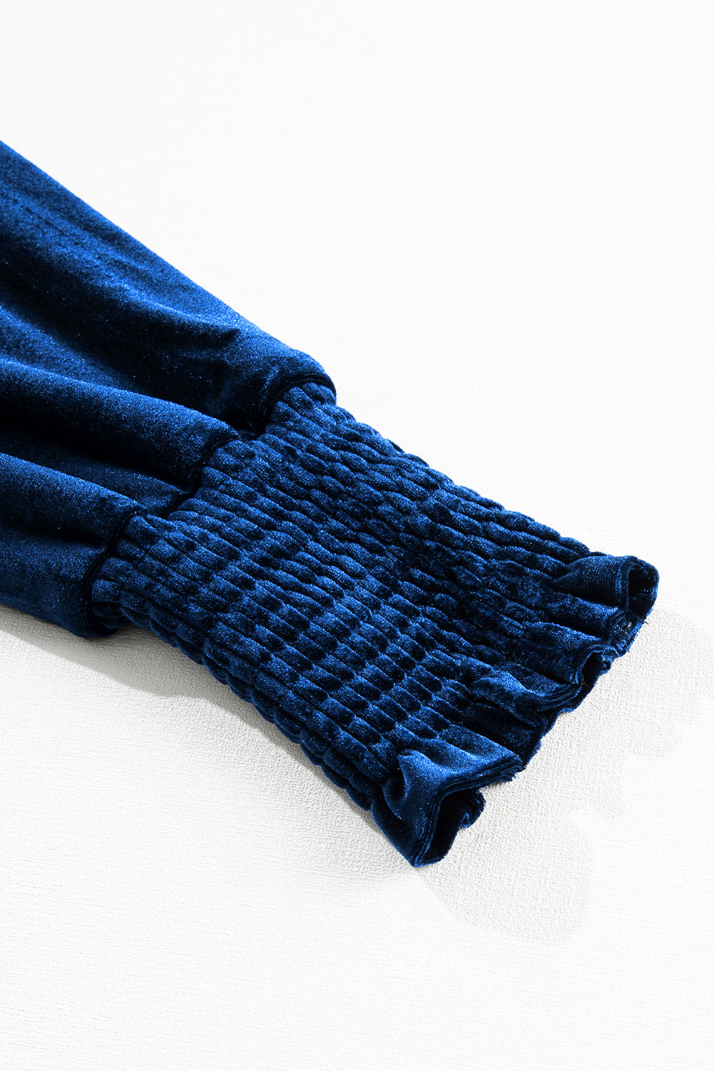 Elevate your style with this blouse. Crafted from plush velvet, it offers a touch of luxury that’s soft to the touch. The playful sleeves and ruched shoulders bring a fun, flirty vibe, while the neck design adds a modest twist. Perfect for pairing with your favorite jeans or skirts, this blouse effortlessly blends elegance with everyday charm. Polyester/Spandex