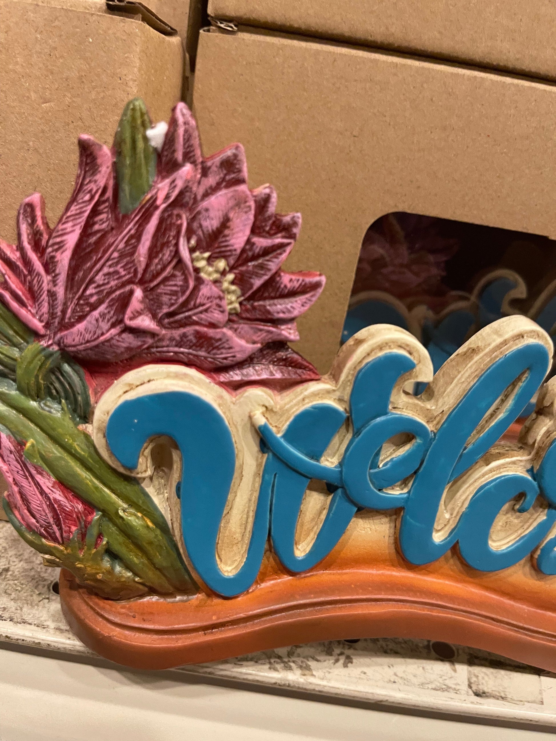 Welcome your guests in style with this 10x5” resin sign. Its durable material resists the elements, making it an ideal outdoor decoration. This sign is the perfect way to elevate your entrance and make a good first impression.