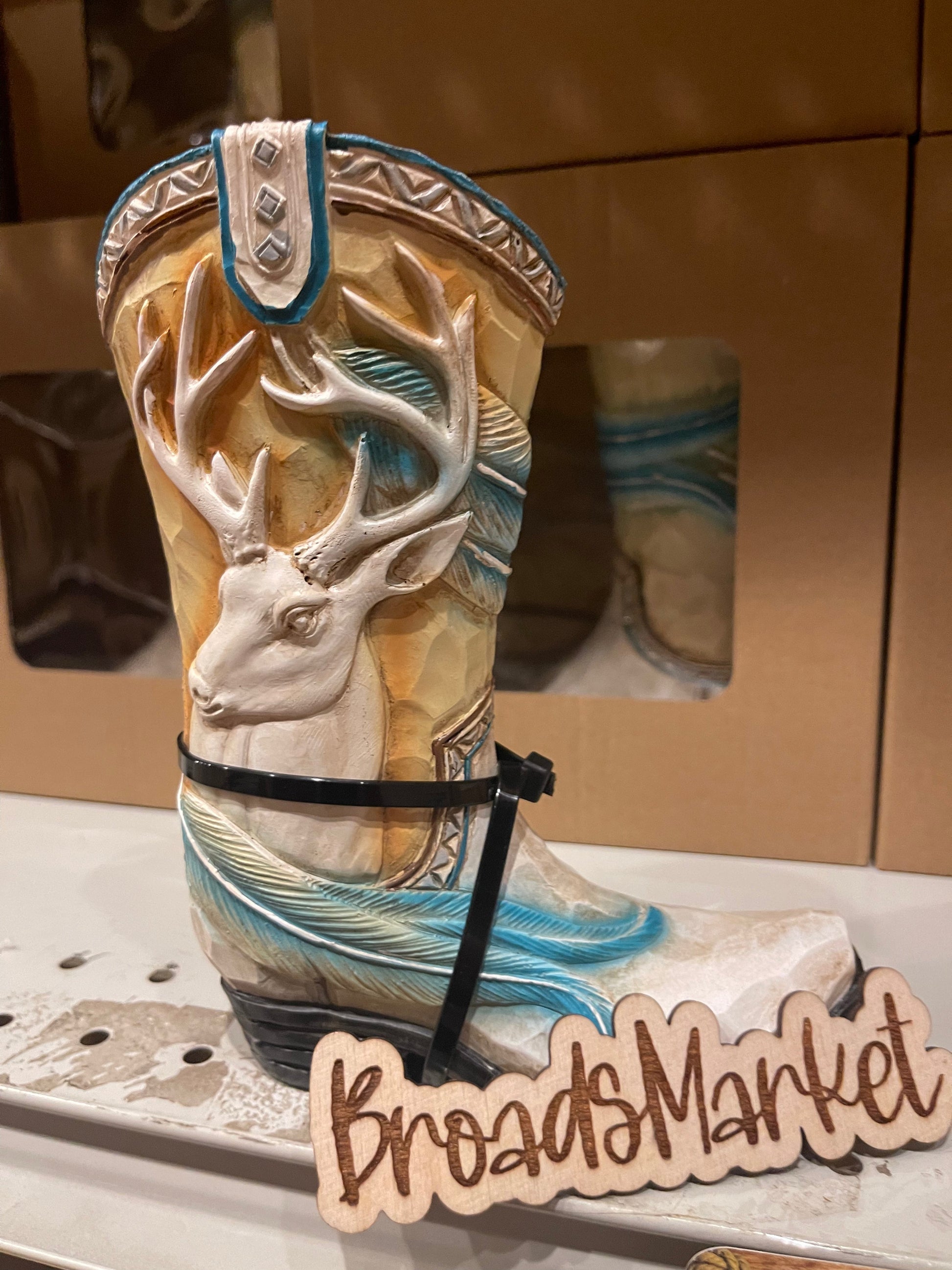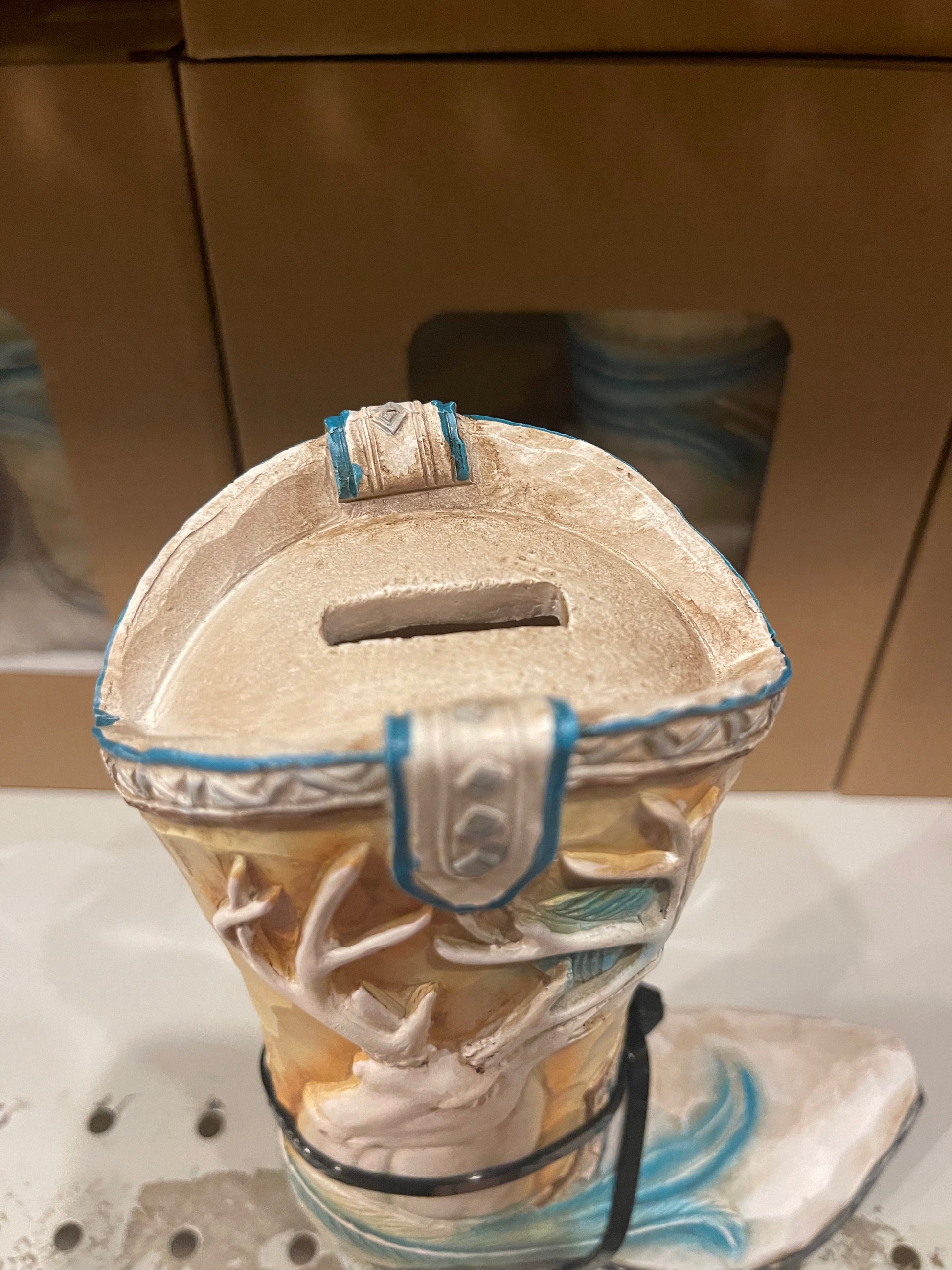 This 7x6” boot piggy bank is made of resin and brings a fashionable rustic touch to your décor. The white and blue deer pattern adds a peaceful country charm to your living space. Perfect for adding a touch of nature to your home.