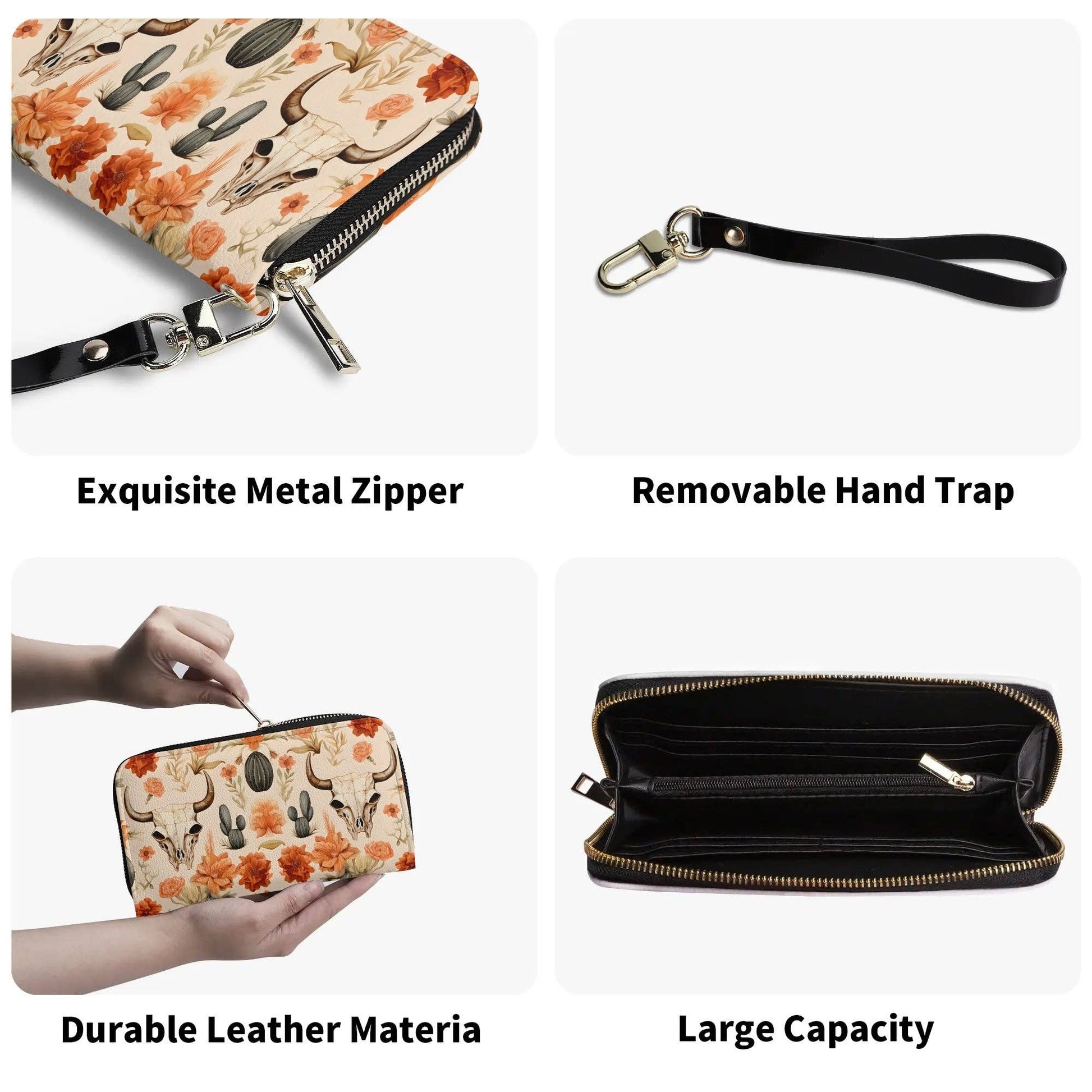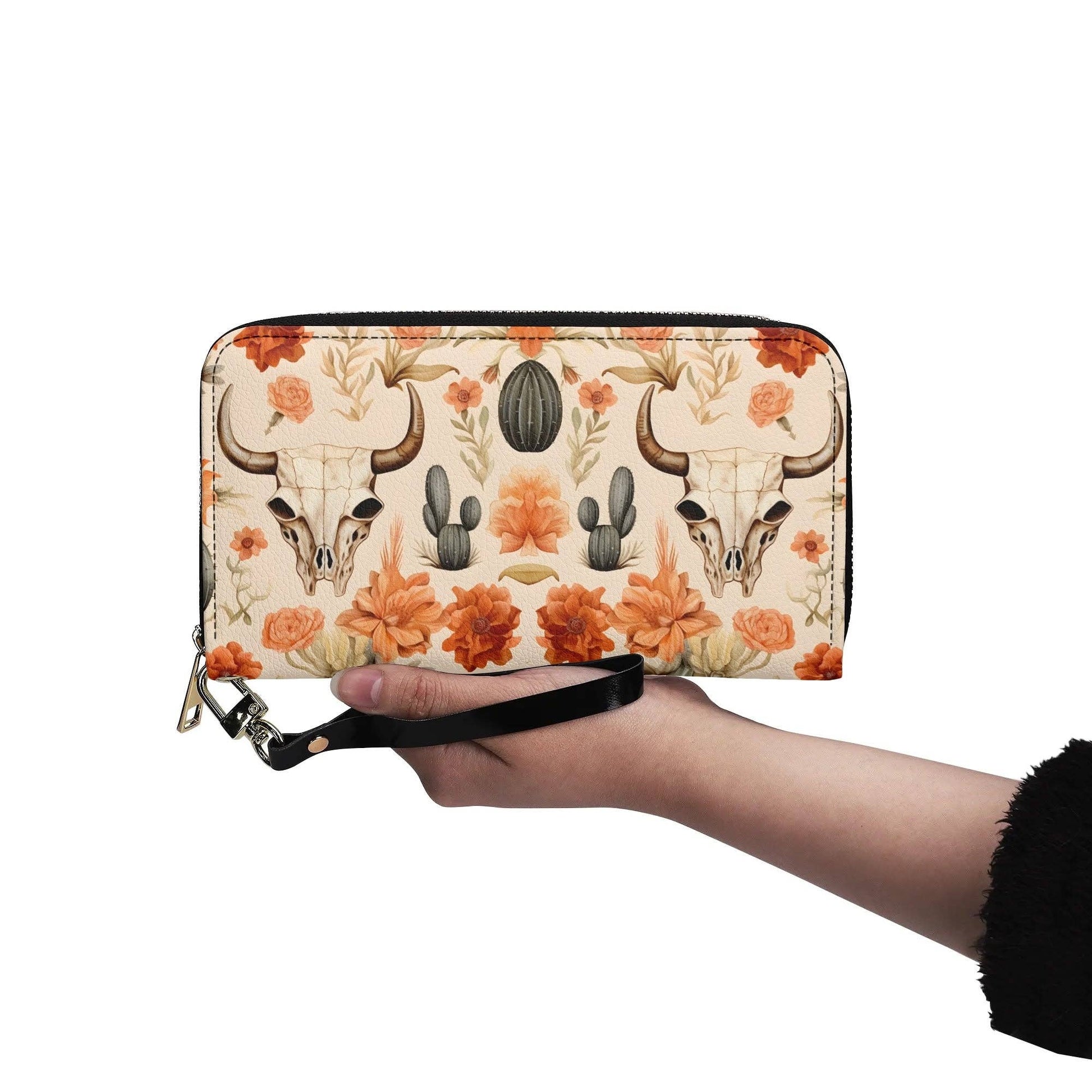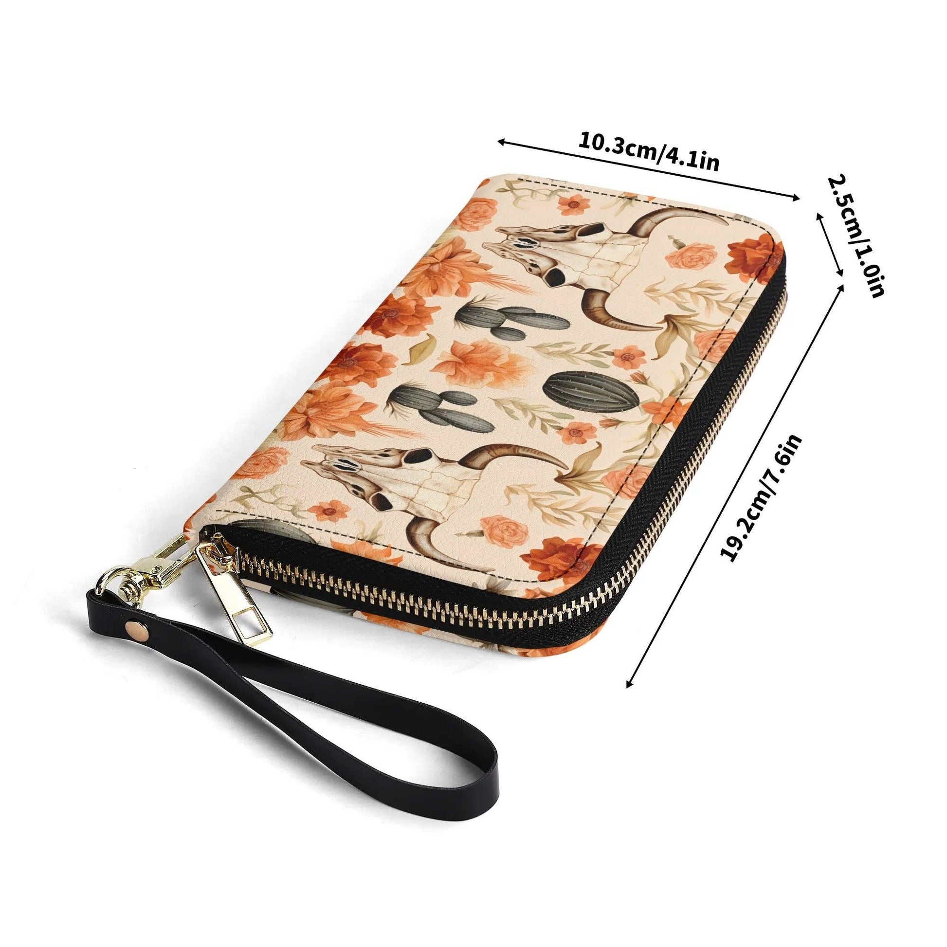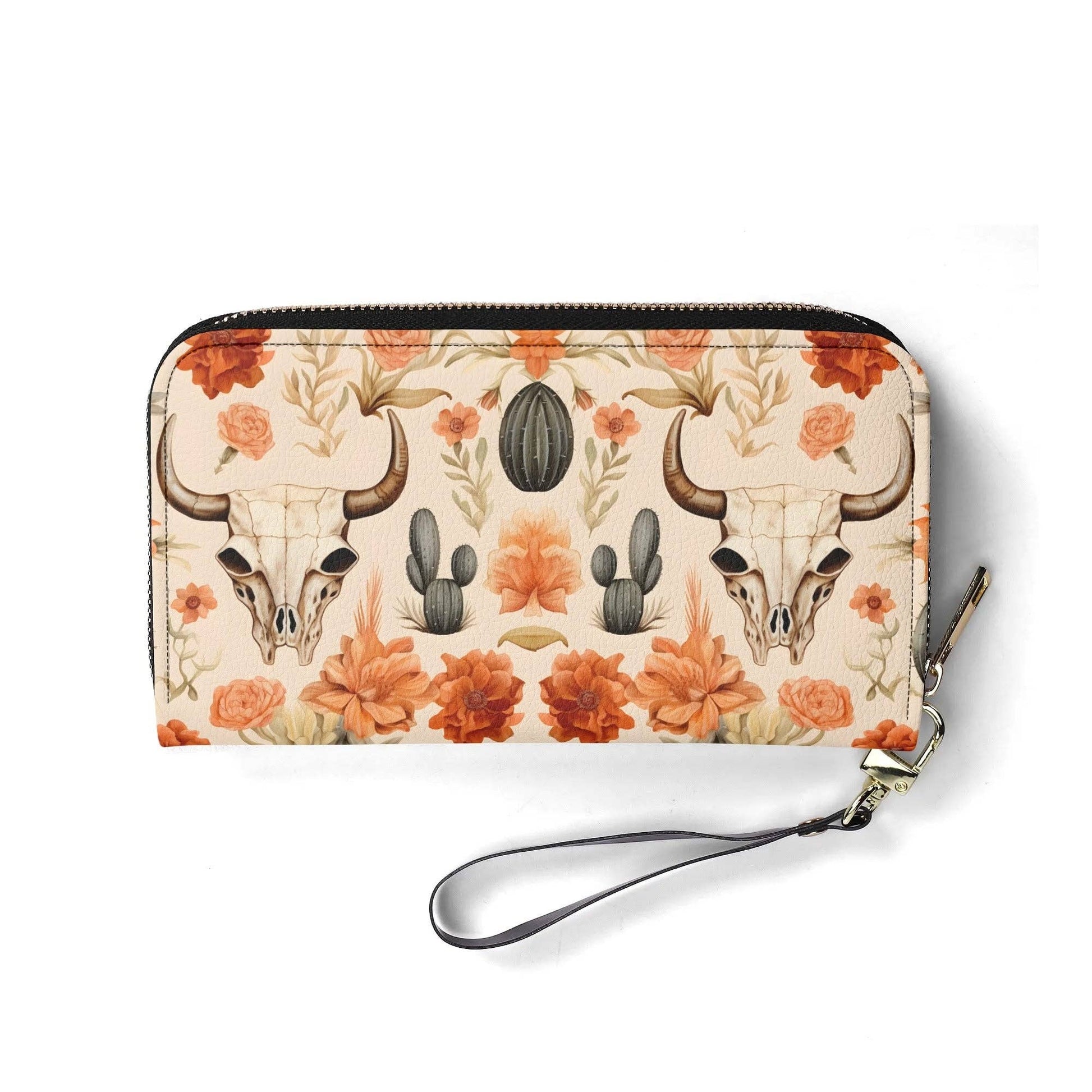 Leather zip wallet with a striking pattern of skulls and flowers. The design includes a cow skull, cactus, and various floral elements on a cream background. The color palette consists of earthy tones like browns and beiges, with accents of red. The skulls and flowers create a unique and edgy aesthetic, perfect for someone who enjoys alternative or Western-inspired fashion.